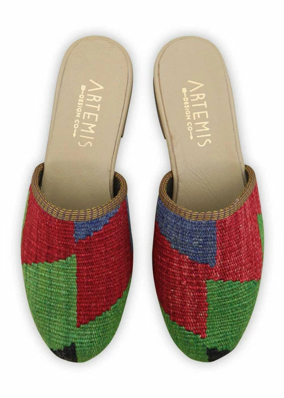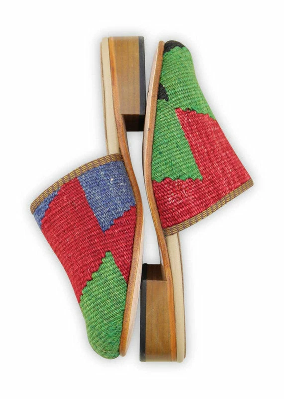 Our Kilim Slides are inspired by a traditional clog silhouette, but feature a sleeker, more feminine profile. This style is very flattering with jeans, skirts, and with short skirts and tights in the cooler seasons. Our Kilim shoes are handmade from vintage, hand-sourced Turkish carpets, which means that no two pairs of our Kilim shoes will ever be alike. The Kilim Slides pictured here are the actual pair that you will receive.