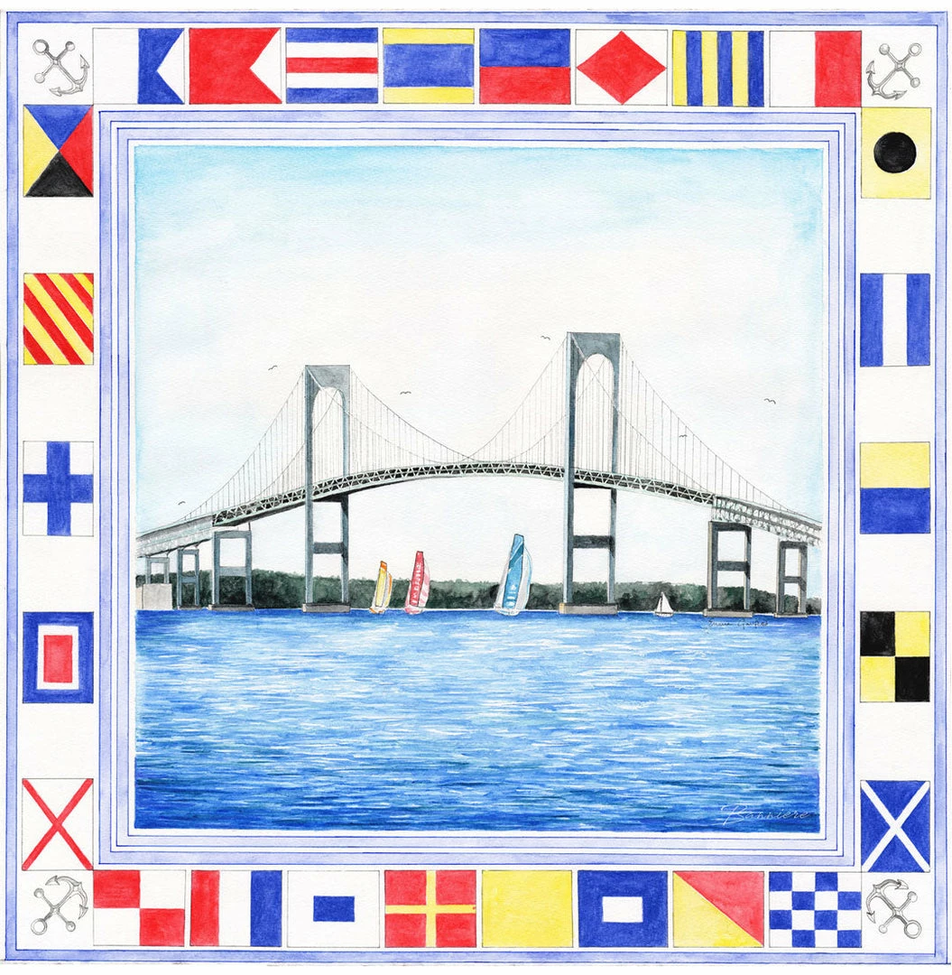 Emma Garfield is a meticulous artist currently living in Newport, RI. Her inspiration for this design came from her background of spending all her life in sailing towns from Marblehead, to Cuttyhunk Island in Buzzards Bay and of course Newport. She first came to Newport as a student at St. Georges and returned to live there after University to establish herself as an artist. In this design, the flags are a staple of the nautical community and remind Emma not just of Newport, but of all the seaside towns that are close to her heart. The Claiborne Pell Newport bridge is a trademark structure and the Volvo Ocean Race sailboats below it are a nod to the historic sailing town’s honored role in the internationally renowned race.