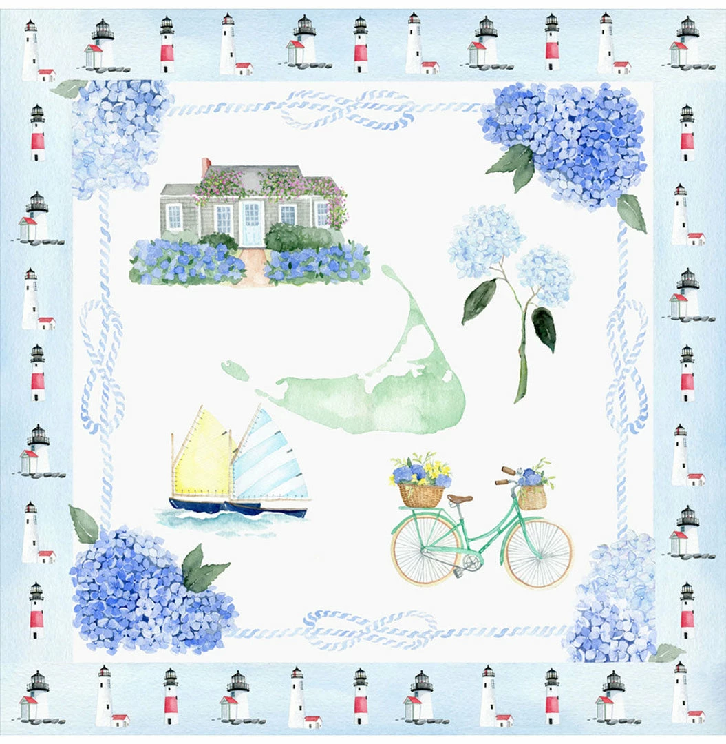 Meredith Hanson is a Nantucket based artist and designer. While trained in numerous fine art mediums, Meredith stumbled upon Gouache a couple of years ago and now it is her signature art form. She moved to Nantucket in the fall of 2011 to open up her design studio where she has collaborated with many of the local businesses on the island and beyond. The nostalgic charm of Nantucket with its luscious seascapes, beautiful hydrangeas and peaceful, simple way of life has given the inspiration for this illustrative scarf. When Meredith is not painting, you can find her strolling, coffee in hand, through Sconset taking in all the island’s beauty with her dog Willis.
