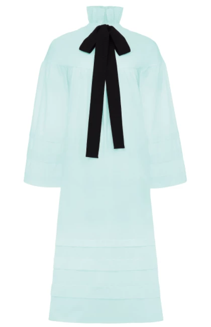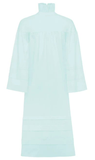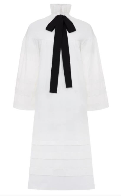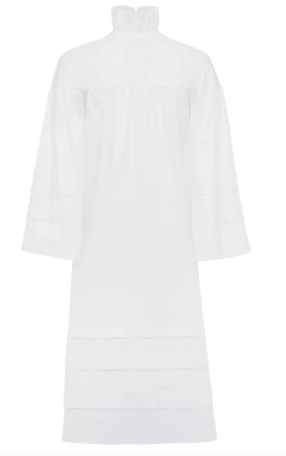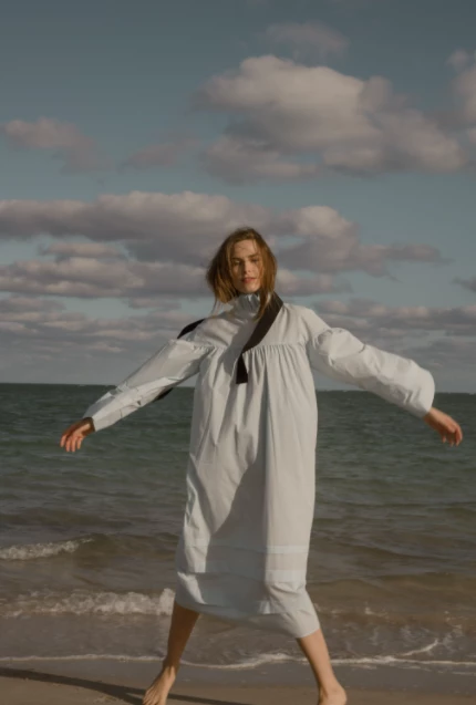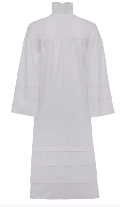Cut from soft organic cotton batiste, the Lydia features dropped shoulders, ruching and delicate sleeves with tucks. A beautiful stand-up ruffled collar with a wide black grosgrain ribbon ties in the back. Slip into bed with a nightgown inspired by the past and designed for the future.