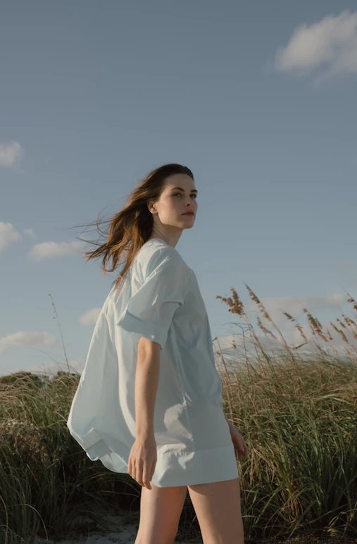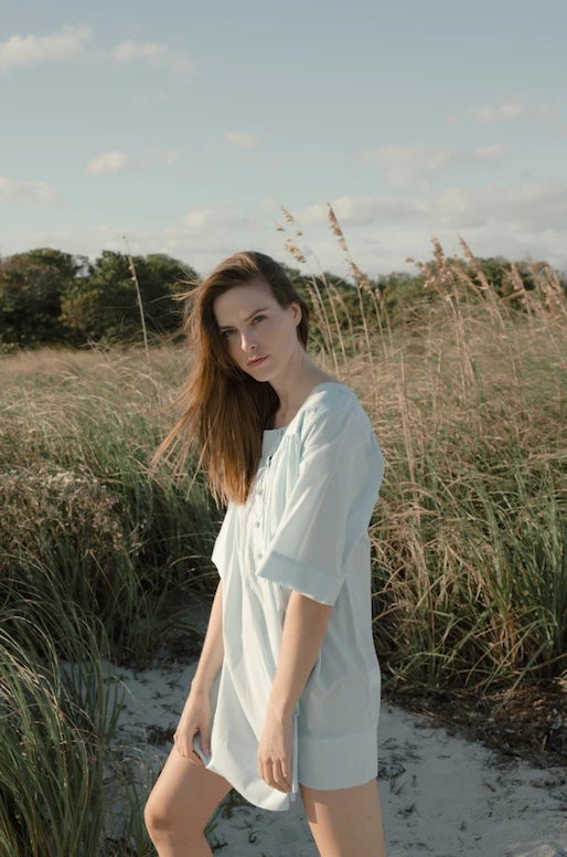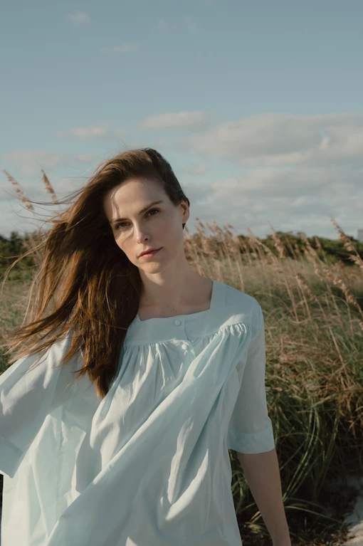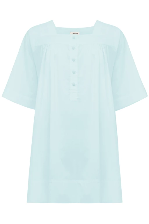Vitoria is a billowing nightgown with gathering at the chest and a wide band at the hem. Opens in the front with a row of fabric-covered buttons that add just a bit of detail. Tuck detailing on the shoulders.
