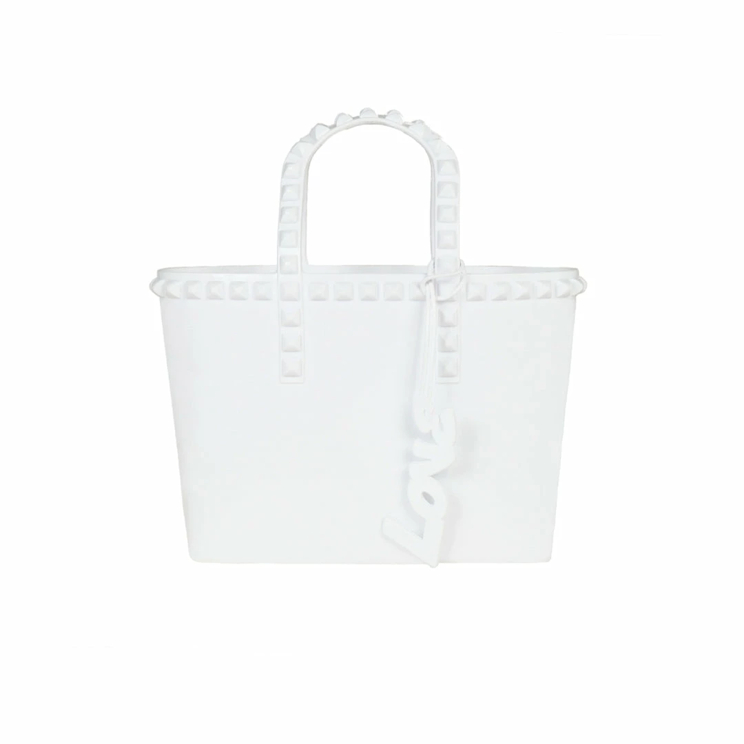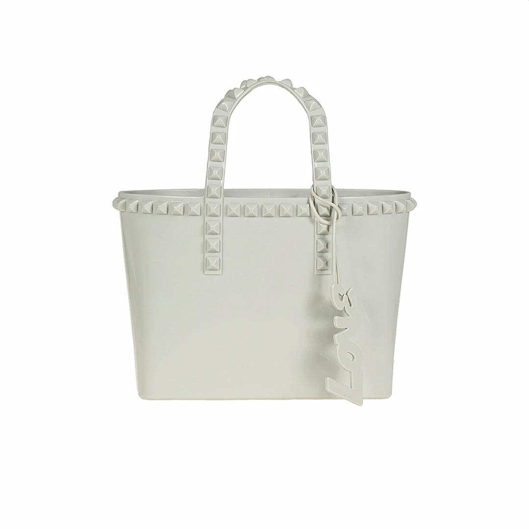 This mini rubber tote bag is perfect for both holding your essentials, or giving your child their first high-fashion jelly bag.