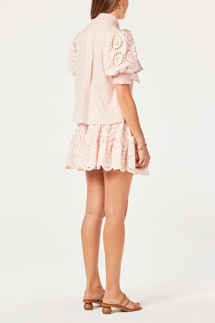 Feminine silhouette featuring a cinched smock waistband for premium comfort. Kylie offers a scalloped hem and 100% breathable embroidered cotton from China. Designed, dyed, and sewn in Los Angeles.