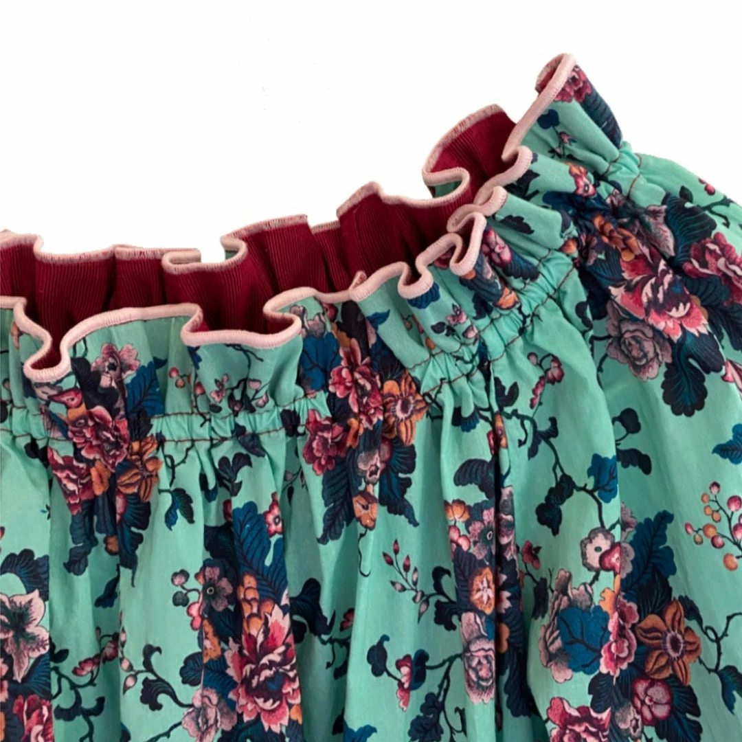 - Inner neck and wrist ruffles lined with ruby grosgrain
