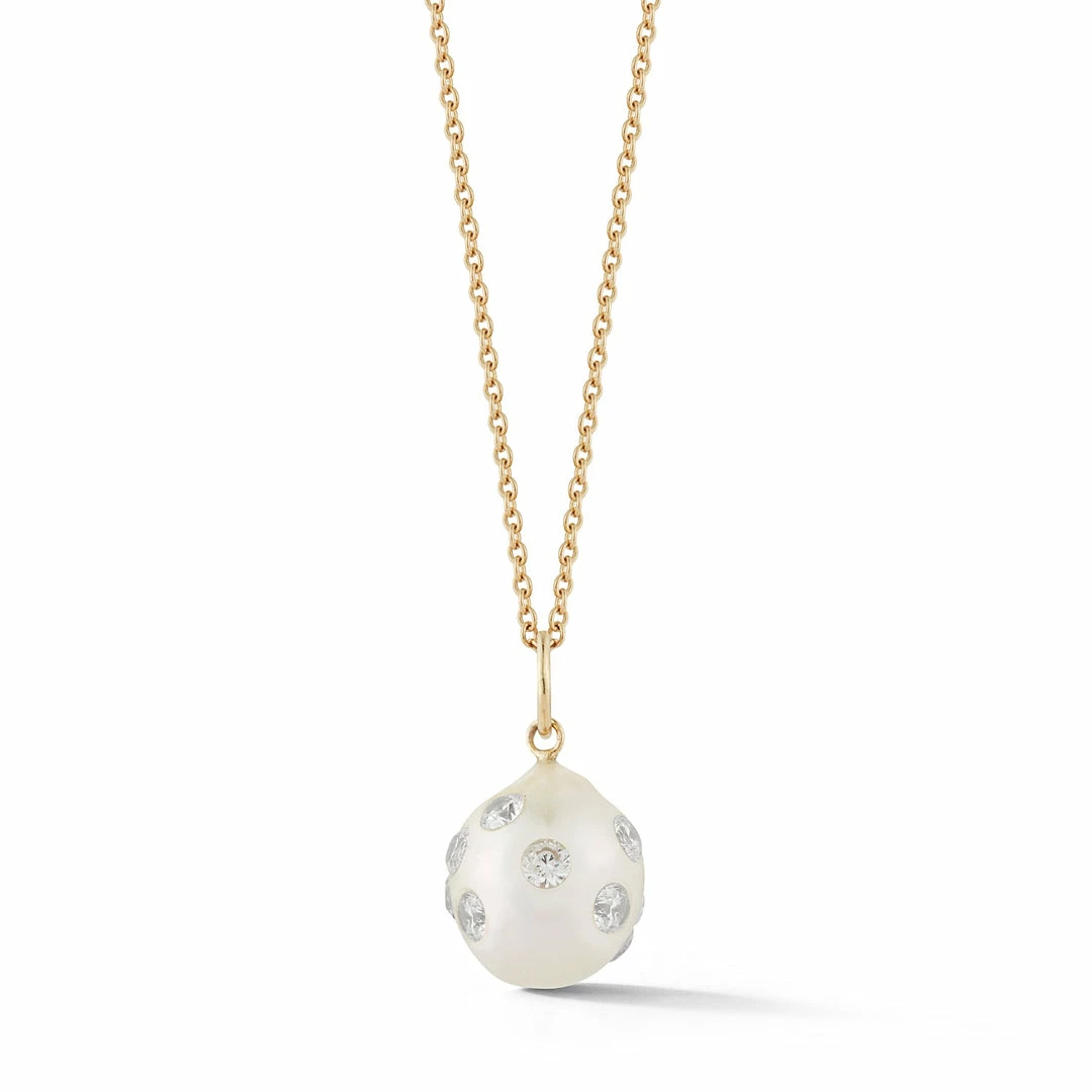 Twelve diamonds grace the surface of this beautiful baroque pearl, making it a one-of-a-kind design every time.Â