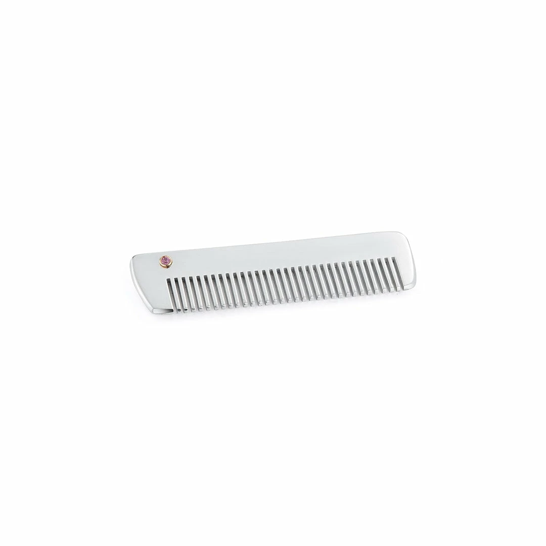 This hand cast sterling silver comb is the perfect baby gift for someone special. It is completely handmade and inlaid with a sapphire bezeled in yellow gold. It can be engraved in block, script, or even your own handwriting.Â