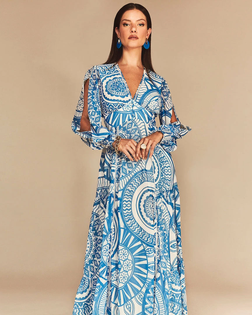 This long sleeve v-neck maxi dress, features our exclusive custom CS mandala print. The Faith creates a dramatic look with it’s gorgeous flowy silhouette. Detailed with sleeve slits, and smocked wrists.