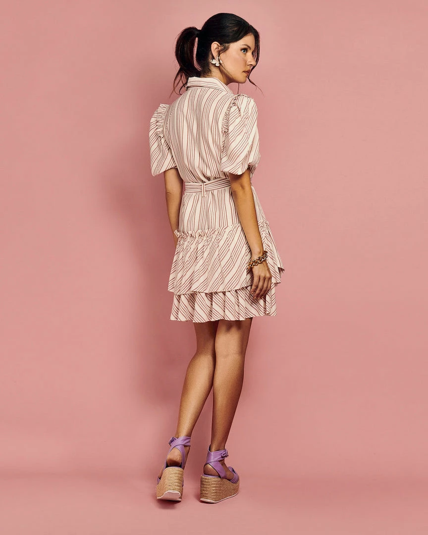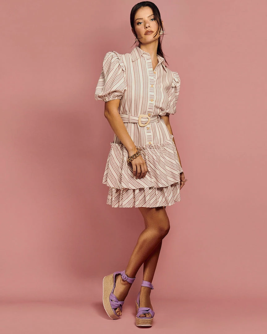This puff sleeve mini dress, features a collared neckline, and a button up soft detail. It comes with a bamboo buckle belt for better styling.