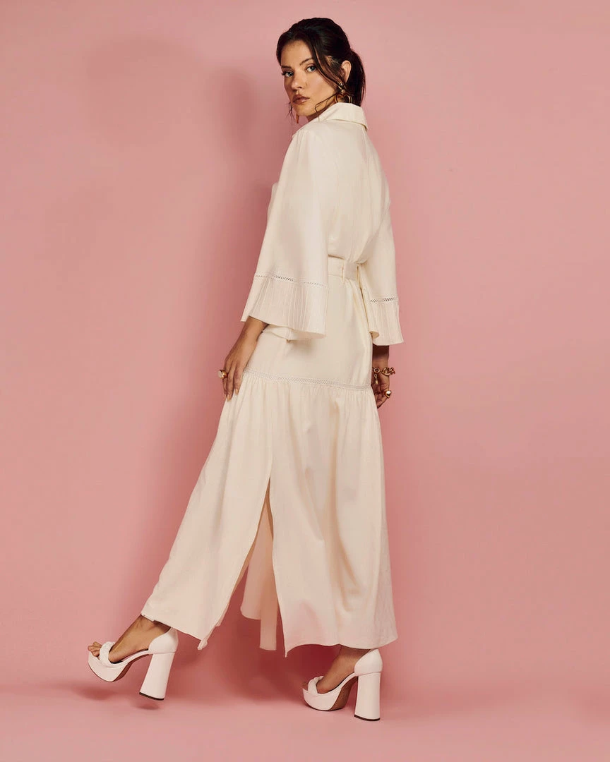 This maxi dress features airy bell sleeves, a collared neckline with a button up detail. Paired with a bamboo buckle belt.