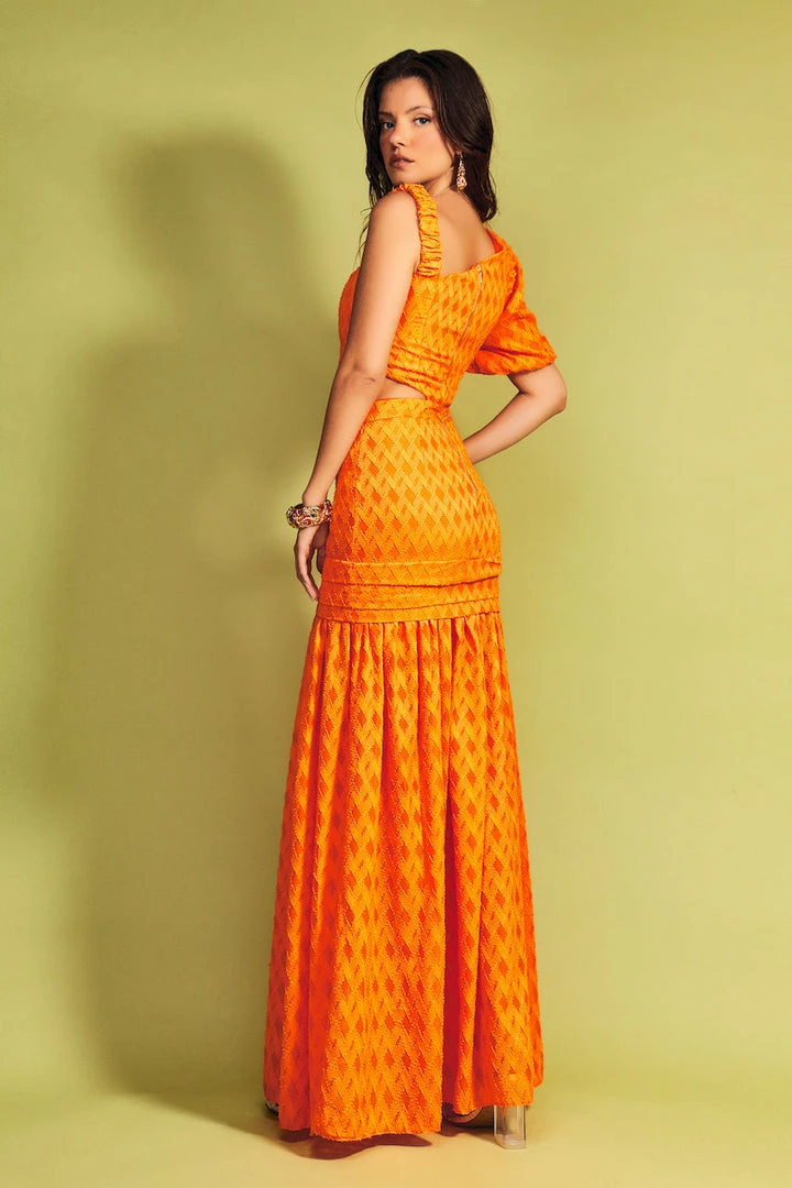 This elegant asymmetrical maxi dress, features a unique puff shoulder and open shoulder strap, as well as side cut-out. The flowy skirt has incredible textured material and an airy slide split.