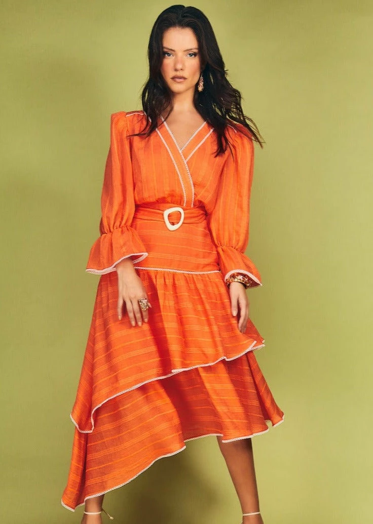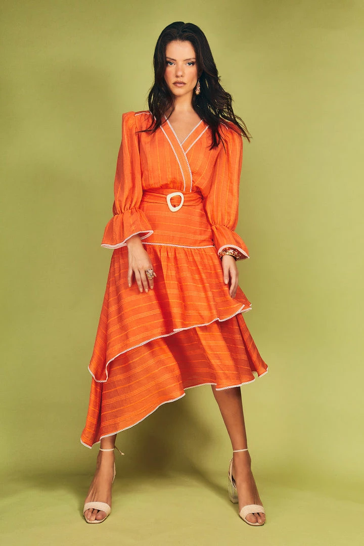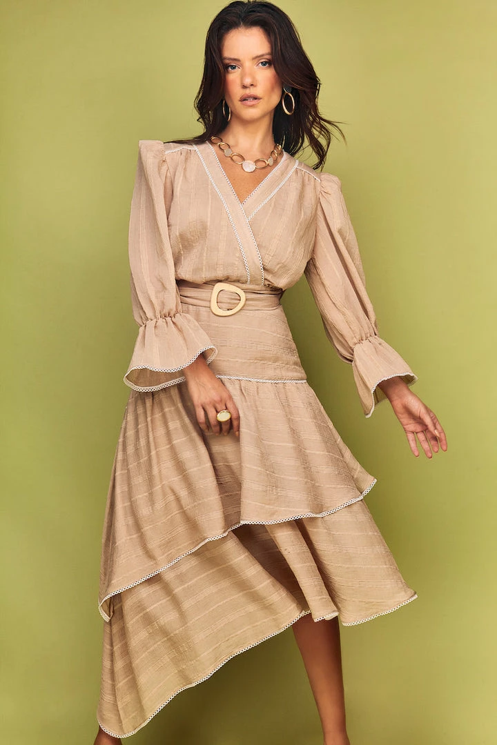 This gorgeous midi maxi dress features a v-neckline, elastic puff wrist, structured shoulders, and ruffled and layered skirt.