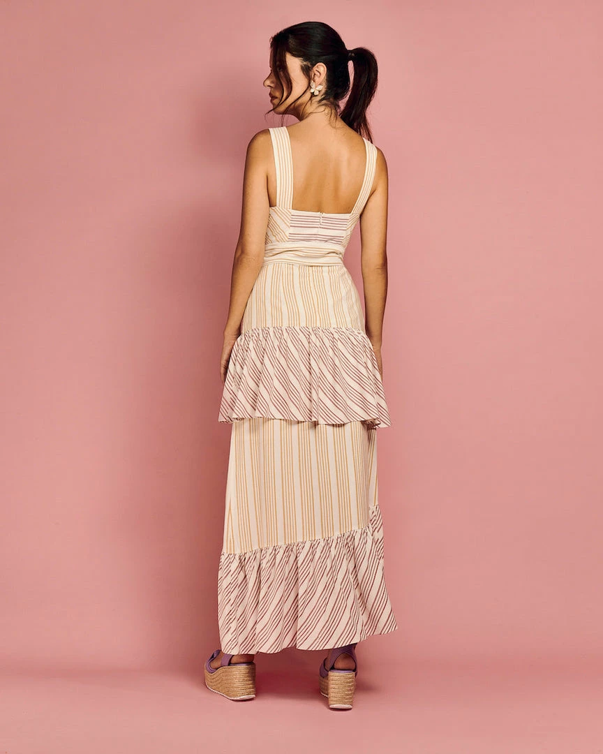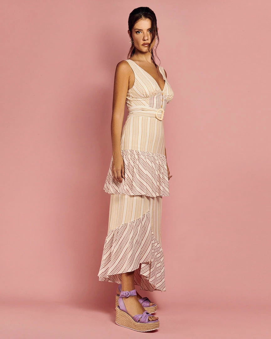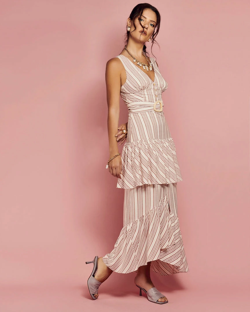 This sleeveless plunging neckline dress, features ruffled layered skirt and comes with a bamboo buckle belt.
