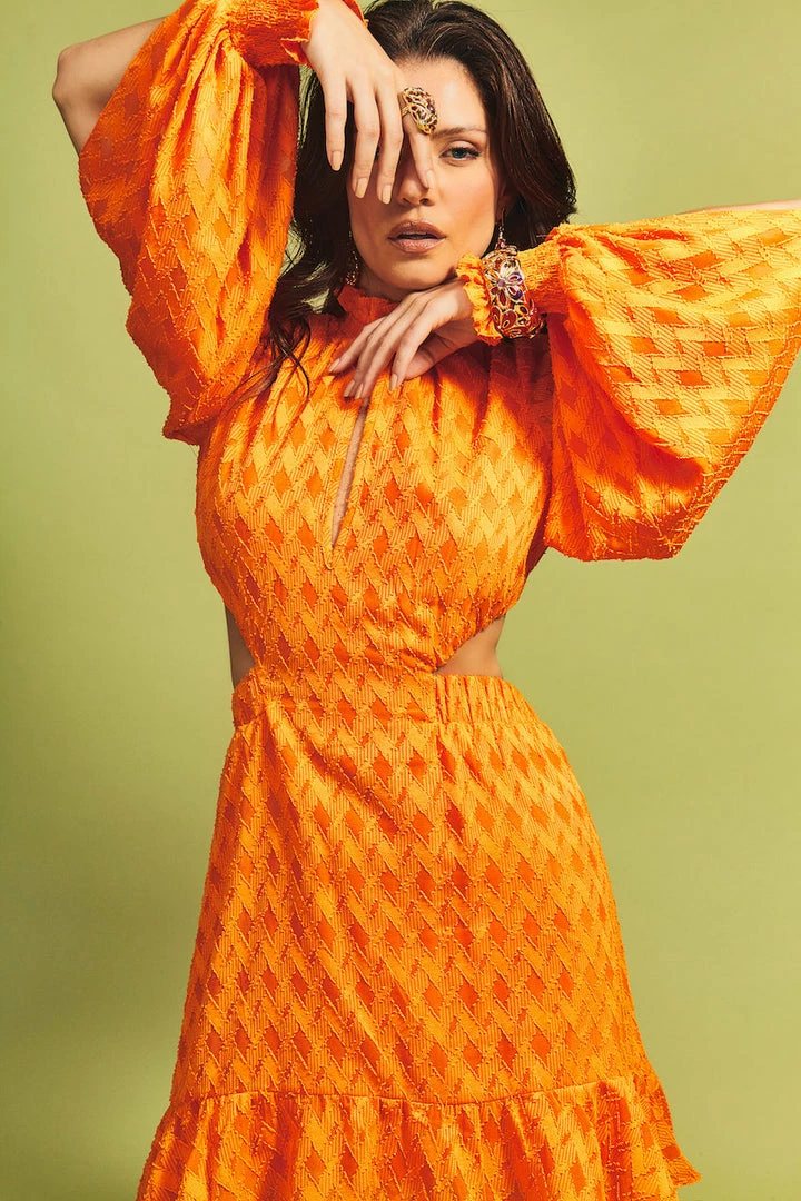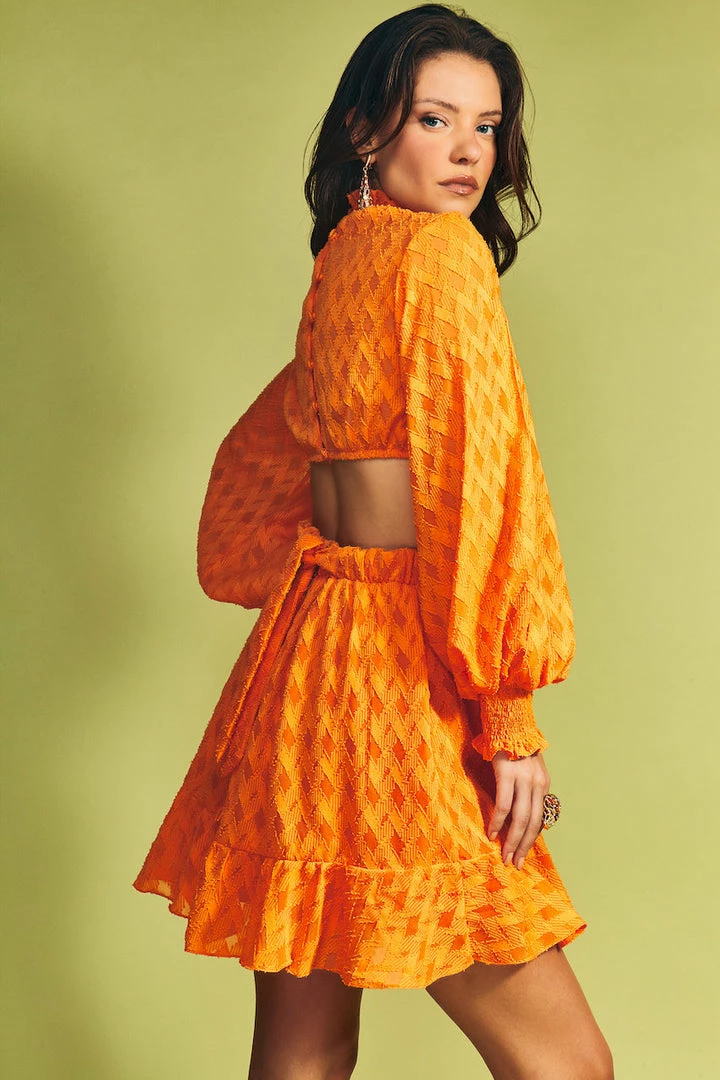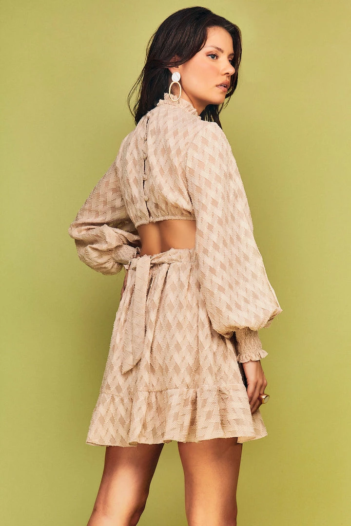 Long sleeve mini dress features a stunning keyhole neckline, airy sleeve slits, an elastic wrist. This dress makes a statement with it’s unique sleeve cut outs and the sexy back cut out.
