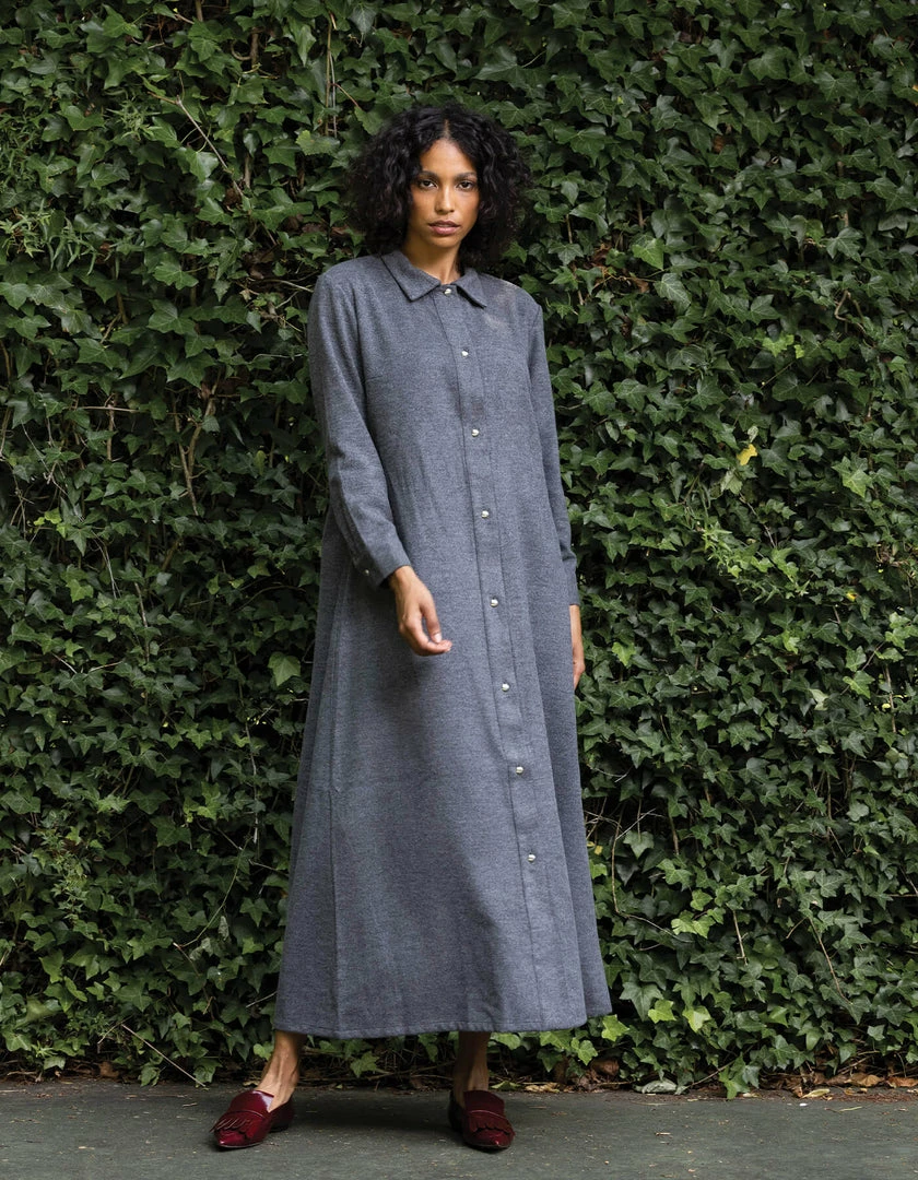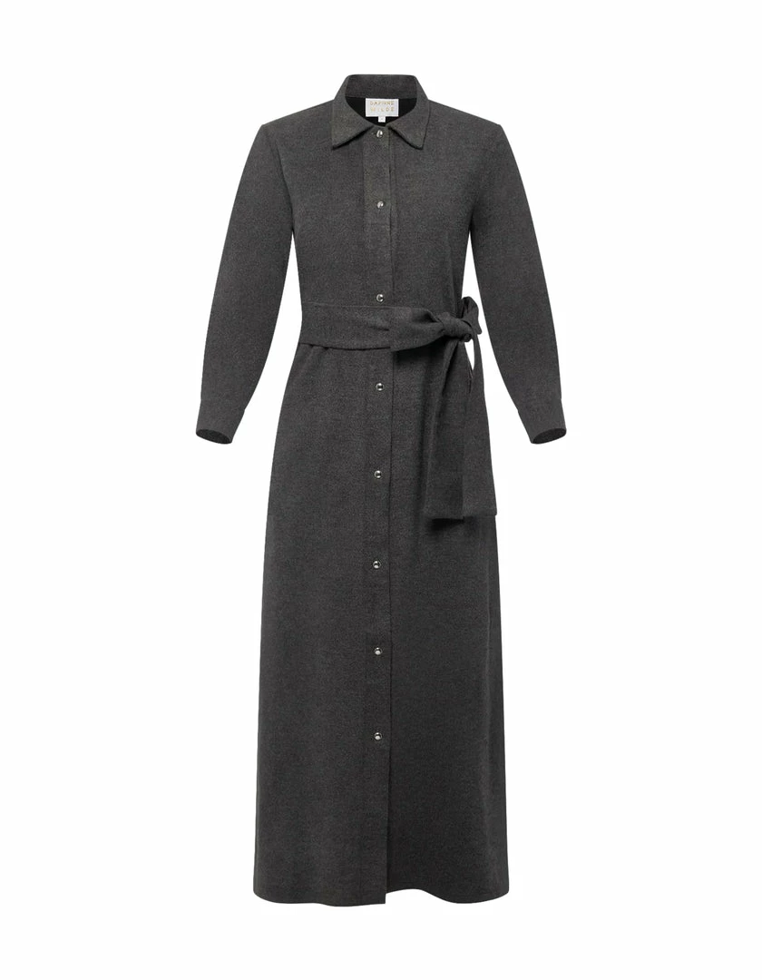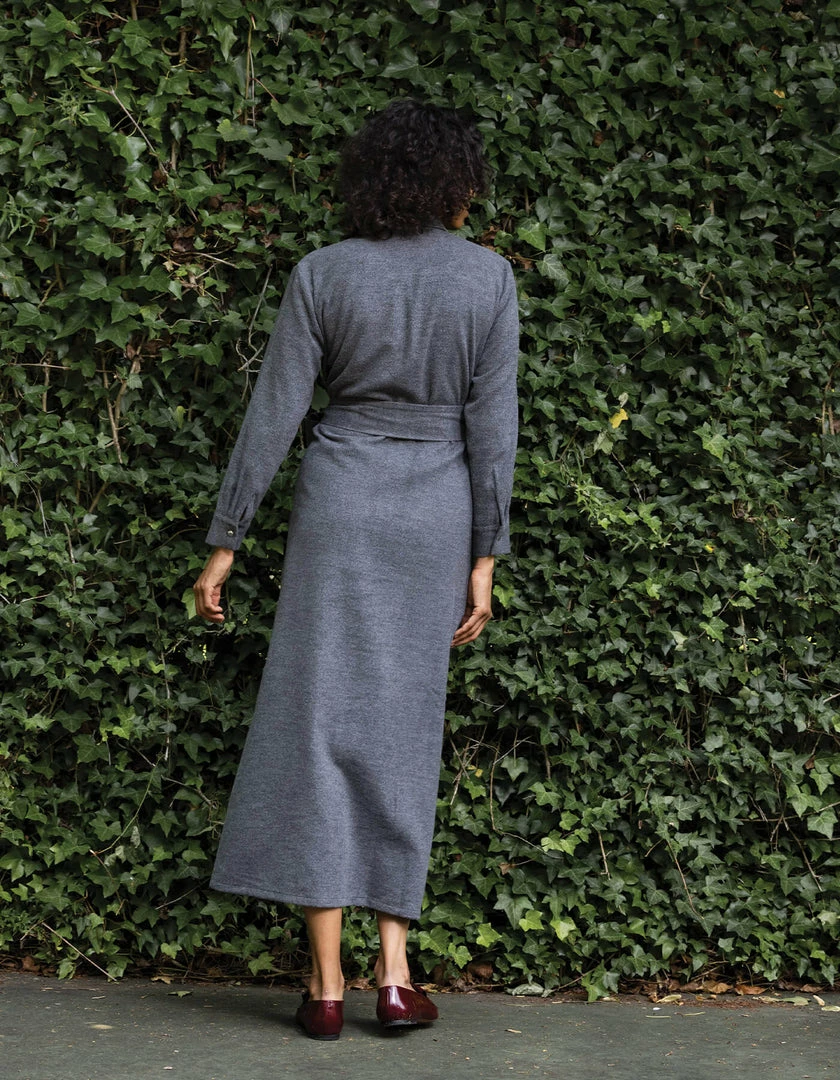 You asked, we answered, and created a longer, leaner version of our original Stella. The Bee is a classic shirtdress that marries femininity with functionality. The charcoal grey is a comfortable viscose blend that you would swear was wool but is machine washable