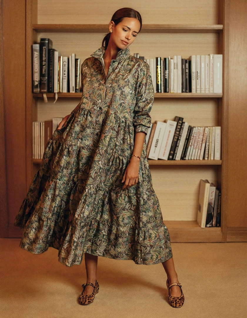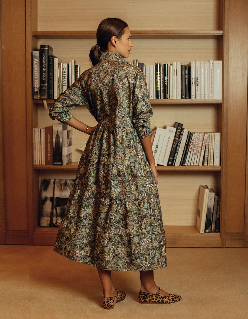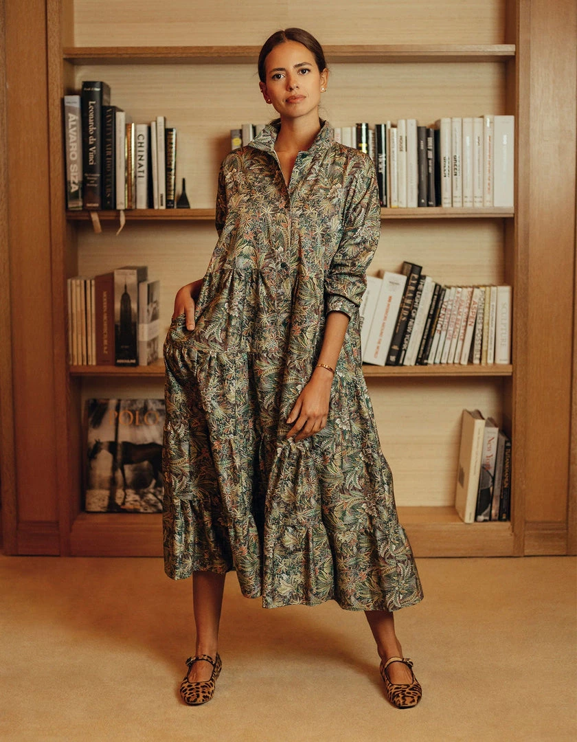 This perennial favorite dress features a universally flattering spread collar, a buttoned placket and a multi-tiered skirt. We love juxtaposition of a classic, heritage print with a bohemian silhouette. This rich Liberty Cotton pattern is printed on Italian cotton and is inspired by the combination of two hand-painted shawl designs, originally created for Liberty in the mid-19th century. A truly spectacular paisley rainforest of tropical palms, feathery leaves and graceful ferns, it is drawn with painstaking detail to achieve a rich depth of color.