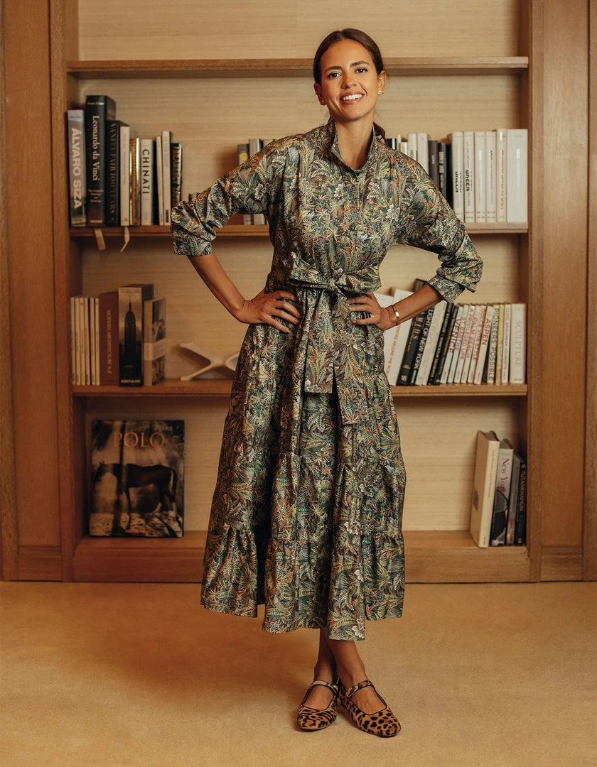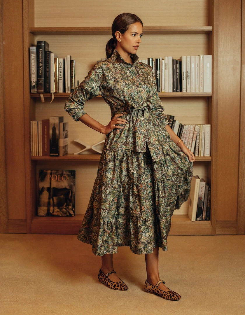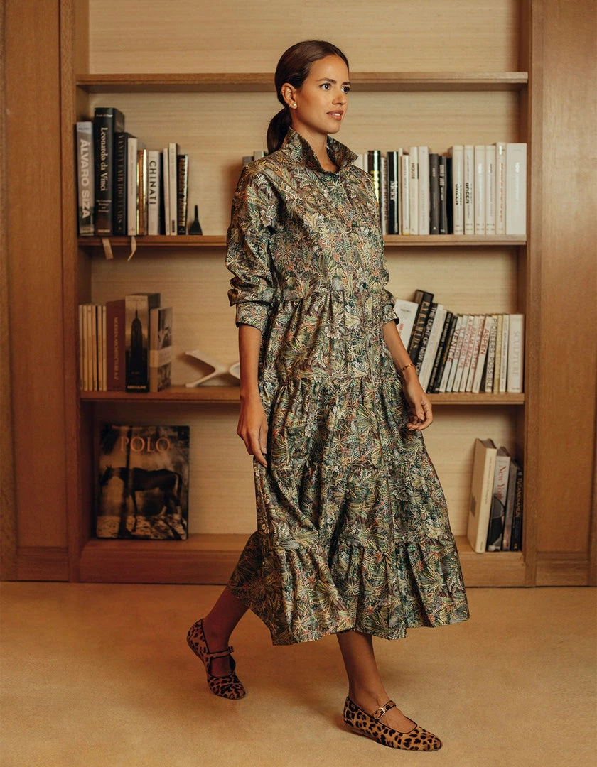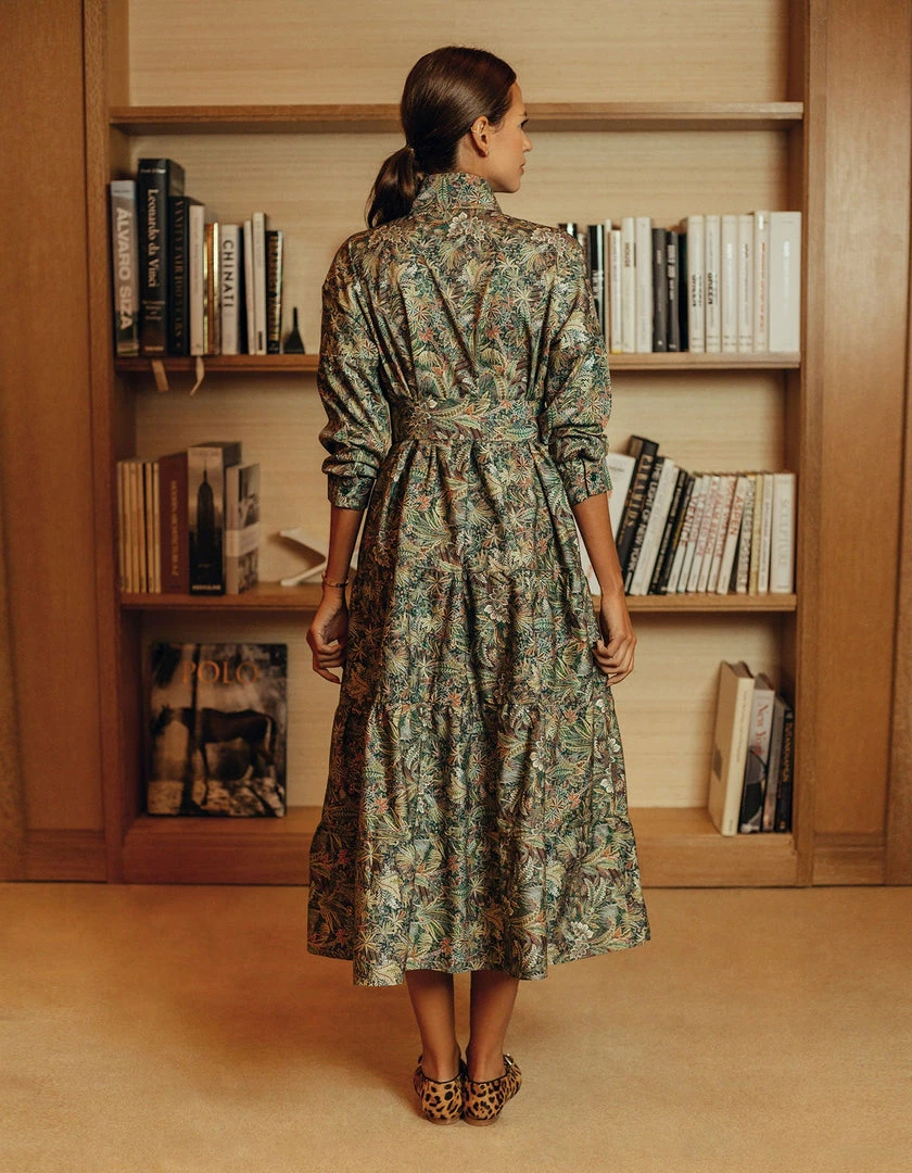 This perennial favorite dress features a universally flattering spread collar, a buttoned placket and a multi-tiered skirt. We love juxtaposition of a classic, heritage print with a bohemian silhouette. This rich Liberty Cotton pattern is printed on Italian cotton and is inspired by the combination of two hand-painted shawl designs, originally created for Liberty in the mid-19th century. A truly spectacular paisley rainforest of tropical palms, feathery leaves and graceful ferns, it is drawn with painstaking detail to achieve a rich depth of color.