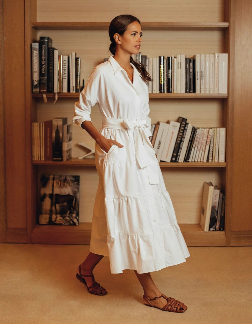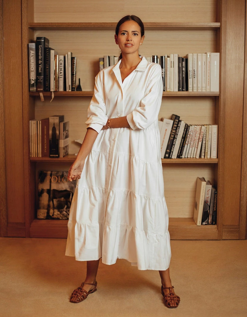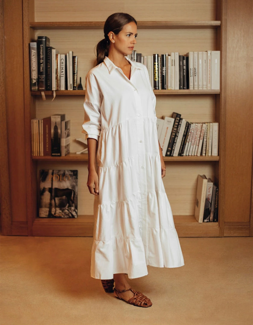 This perennial favorite dress features a universally flattering spread collar, a buttoned placket and a multi-tiered skirt. We love juxtaposition of a classic, heritage print with a bohemian silhouette. The dress is made in Italy using OEKO-TEX certified Italian cotton.