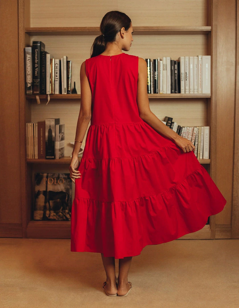 Our newest style is perfect for summer. This flowing tiered dress makes a dramatic statement and is universally flattering. There is a zipper in the back and, like all of our dresses, it has pockets and is machine washable.