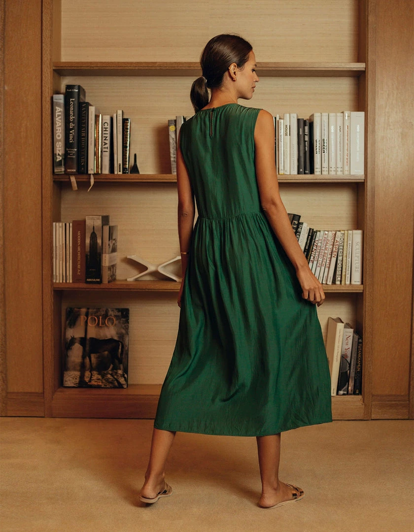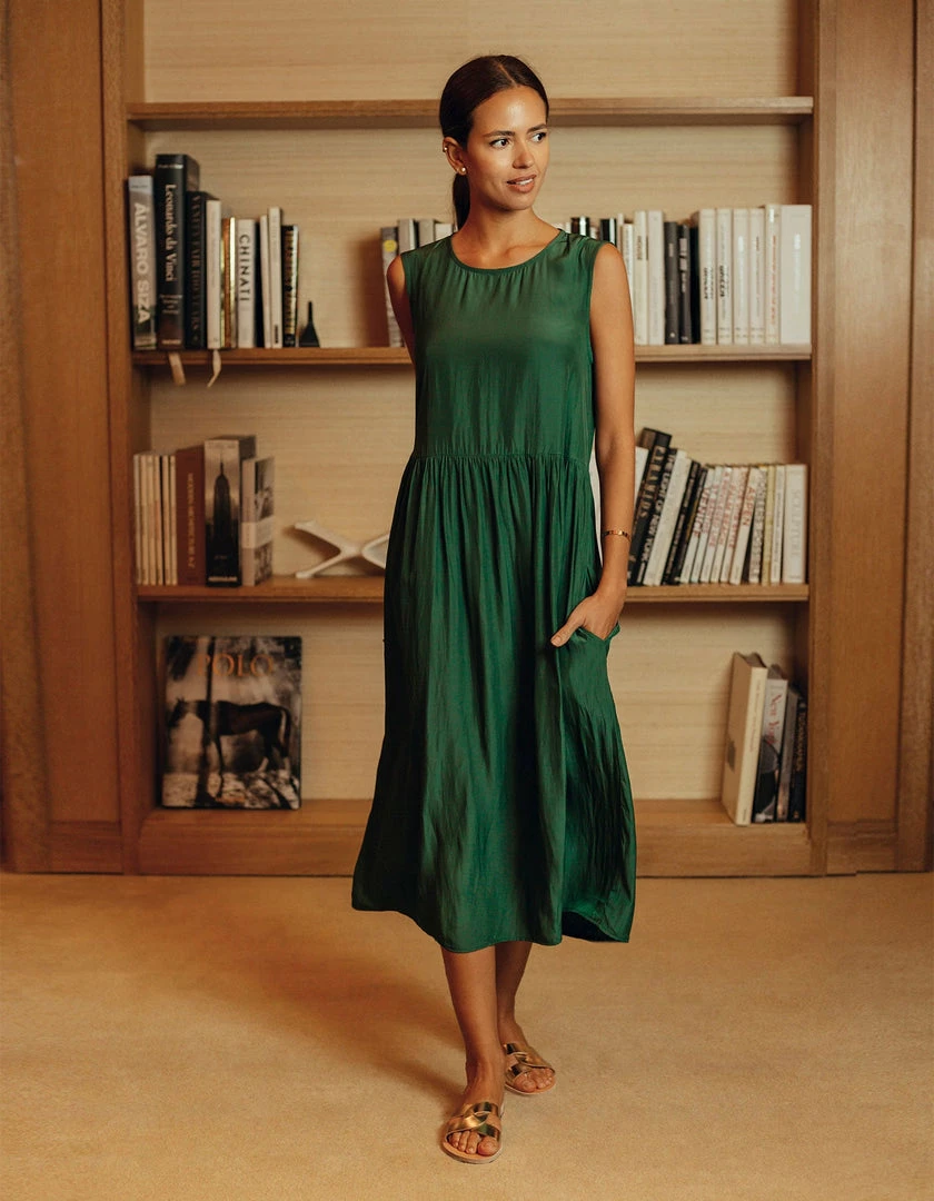 A streamlined housedress for warmer months. This fit is incredibly comfortable – shaped to be relaxed yet structured. The fabric feels and drapes like silk but is a blend that is washable and comes from a mill in Japan.