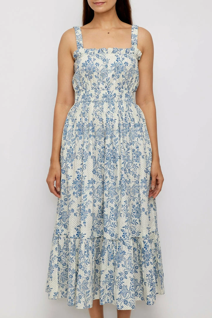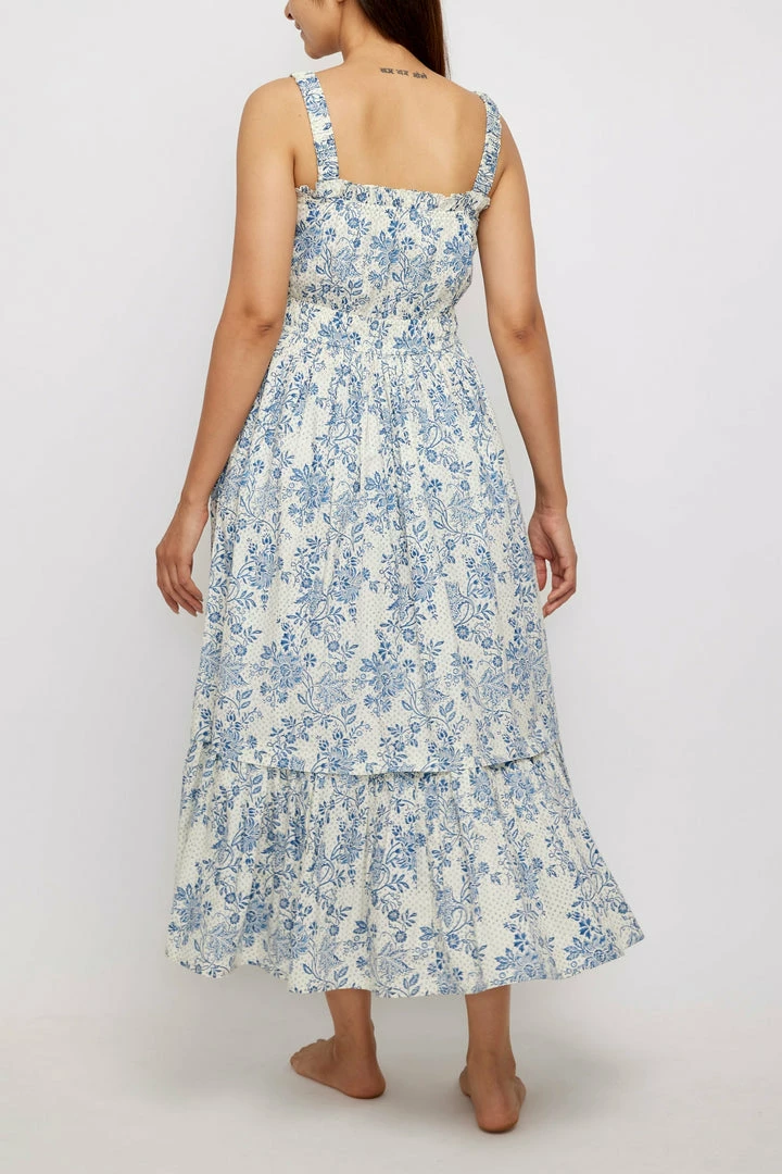A very pretty sun-dress. The Florence is made from hand-block printed cotton poplin with gathered elasticated straps and a gathered bodice with pretty neckline frill and stretch waistband