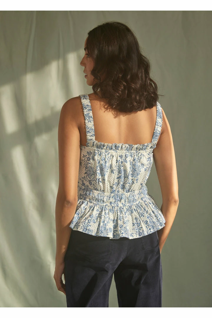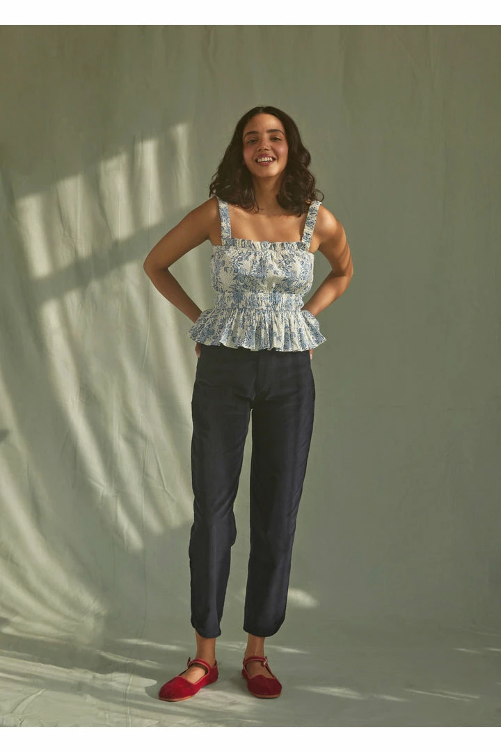 A very pretty sun-top. The Florence is made from a light hand-block printed cotton with gathered elasticated straps and a gathered bodice with gentle neckline frill and stretch waistband