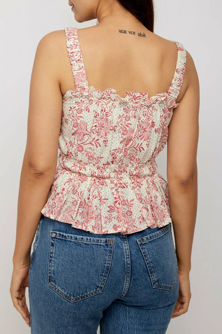 A very pretty sun-top. The Florence is made from a light hand-block printed cotton with gathered elasticated straps and a gathered bodice with gentle neckline frill and stretch waistband