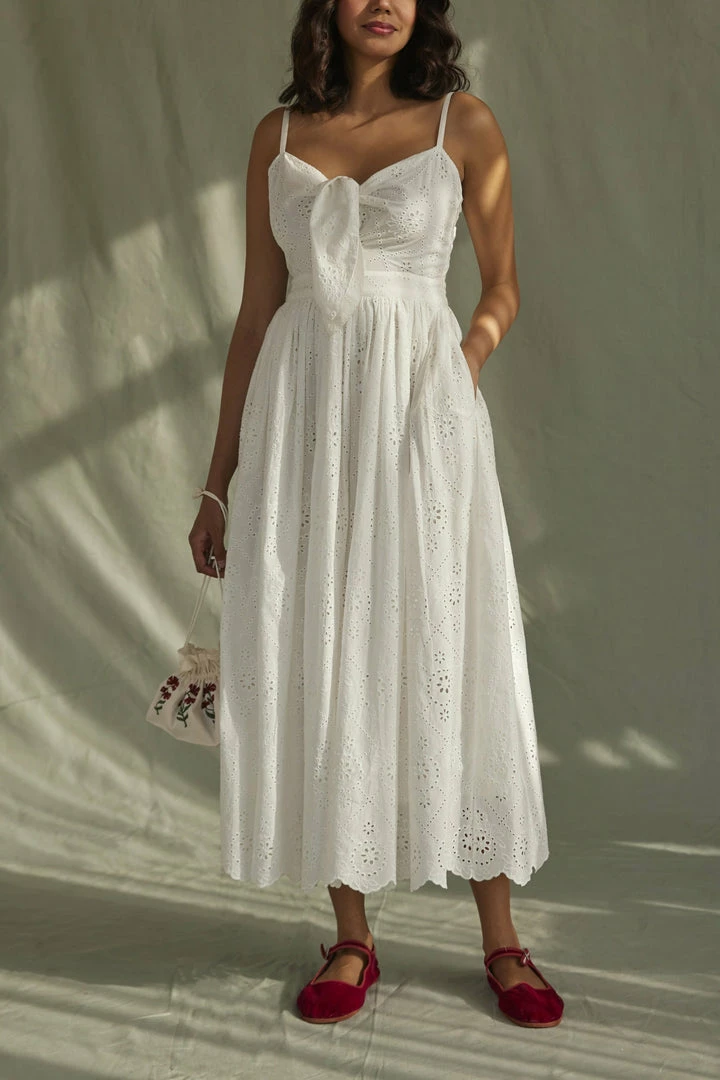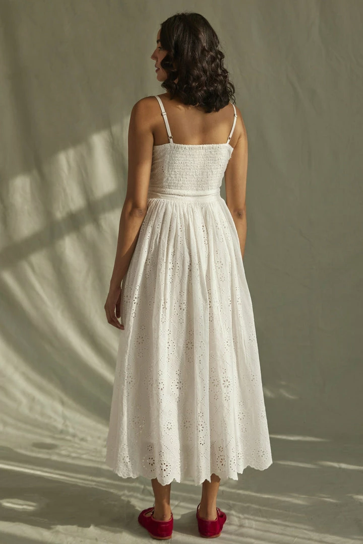 A darling sun-dress with French Riviera vibes in white cotton broderie anglaise with a pretty tie front and scalloped border detail. The straps are adjustable and the back of the bodice is smocked for a lovely fit.
