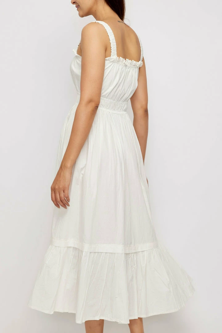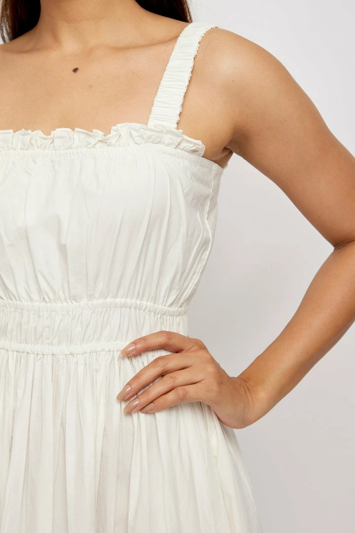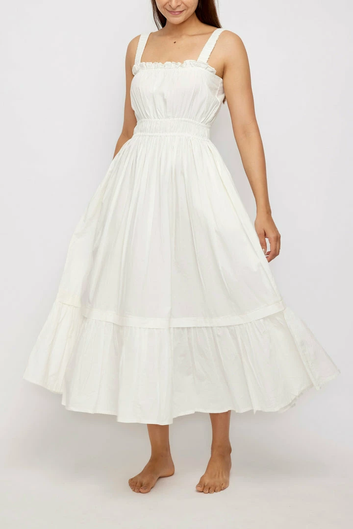 A very pretty sun-dress. The Florence is made from hand-block printed cotton poplin with gathered elasticated straps and a gathered bodice with gentle neckline frill and stretch waistband
