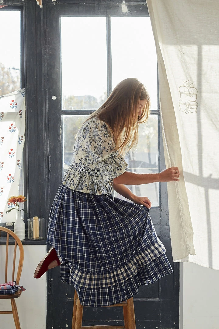 A great little skirt in a picnic handwoven cotton check based on an 19th Century French design. The skirt has an elasticated waist and ties. Perfect worn with the Priyanka and Florence tops
