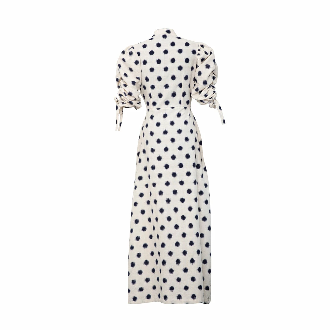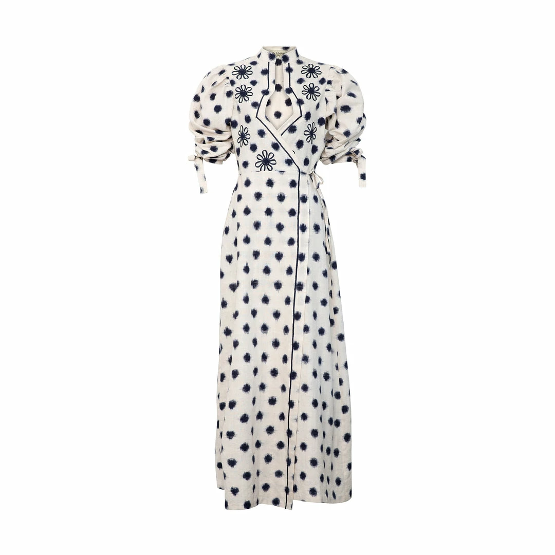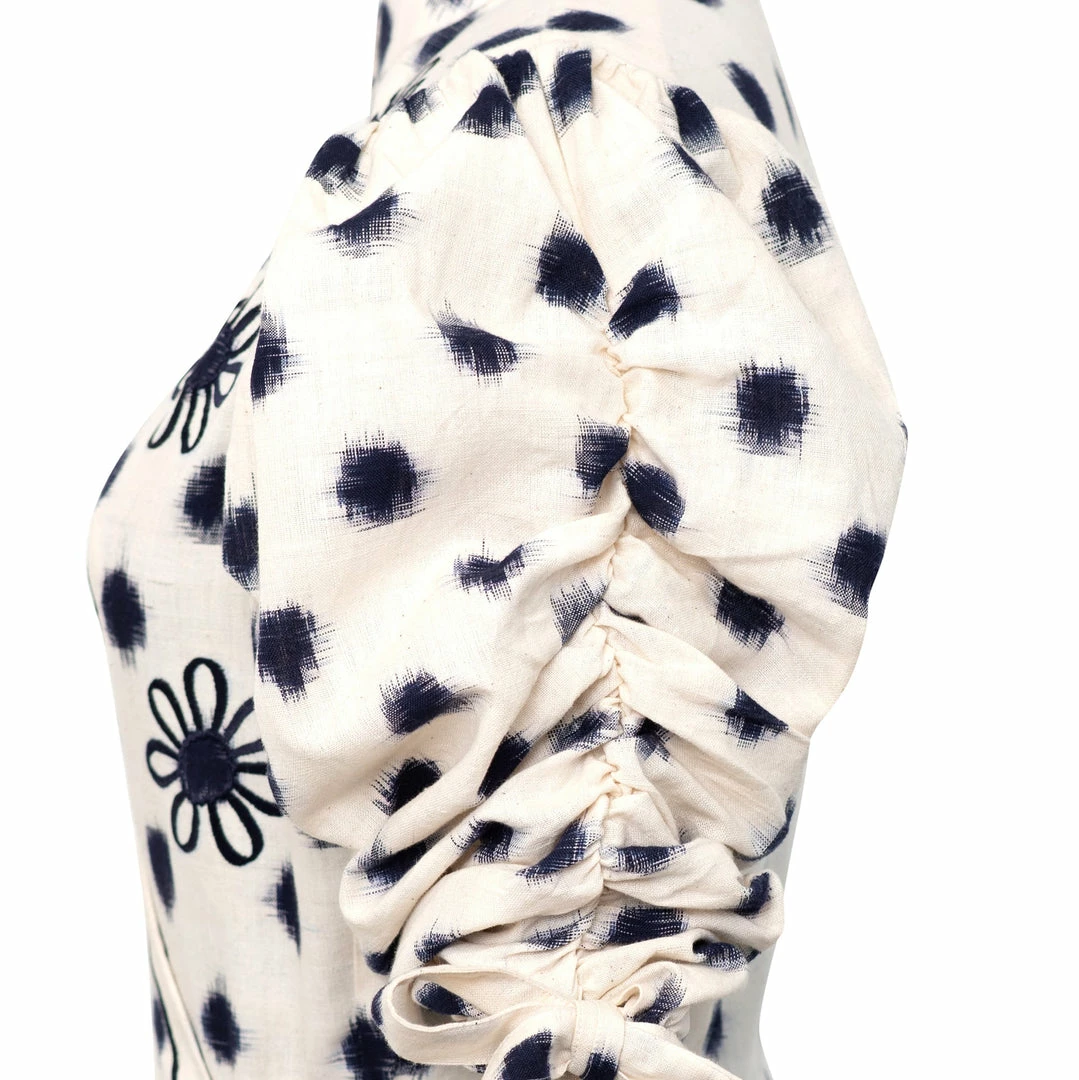 The Campo dress is made of double Ikat from India. This wrap dress features navy blue dot-like pattern on white with flower embroidery, deep geometrical neckline and gathered puff sleeves.