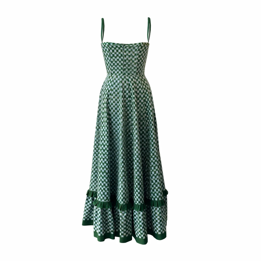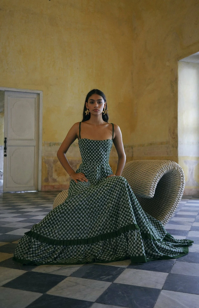 Long dress with cinched waist and corset bodice made in check green and white handloom Ikat. it features two green lined tiers, shoulder straps and zipper in the back.