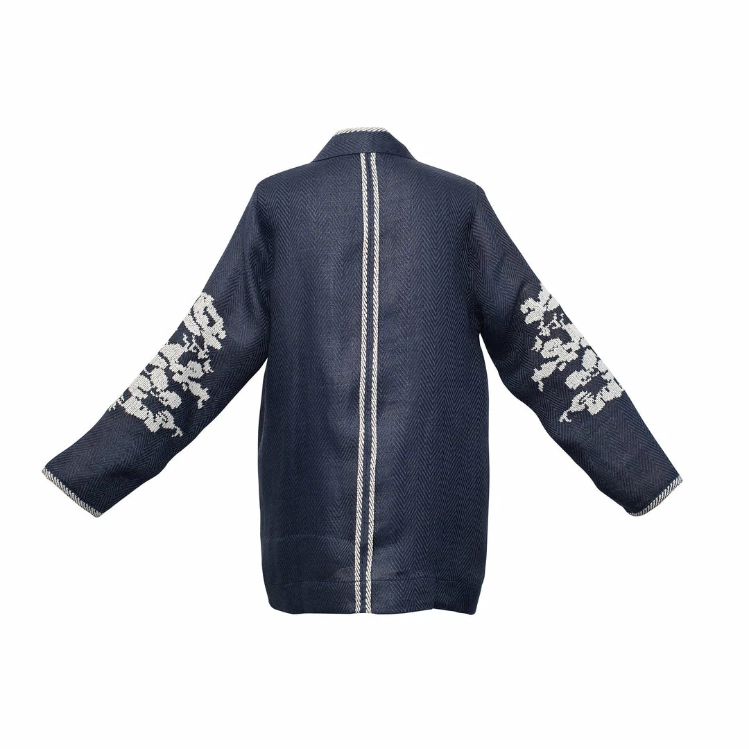 The Cielo Jacket is made of flowy linen from the South of India. This sky blue kimono style jacket features soft hand-embroidered flowers on each sleeve.