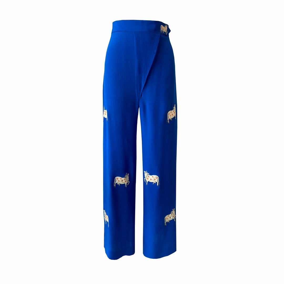 The Cow Pants are made of soft handloom crepe silk. These high-waisted royal blue pants feature asymmetrical flap across the front and white cow embroidery on the legs.
