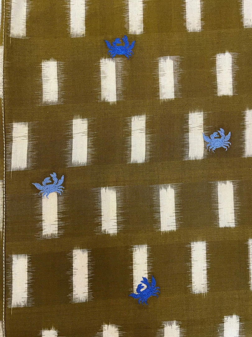 These high waisted  trousers are made from handloom Ikat. They feature a vertical stripe pattern in cream and red embroidery. The silhouette is slightly A with frontal pockets.