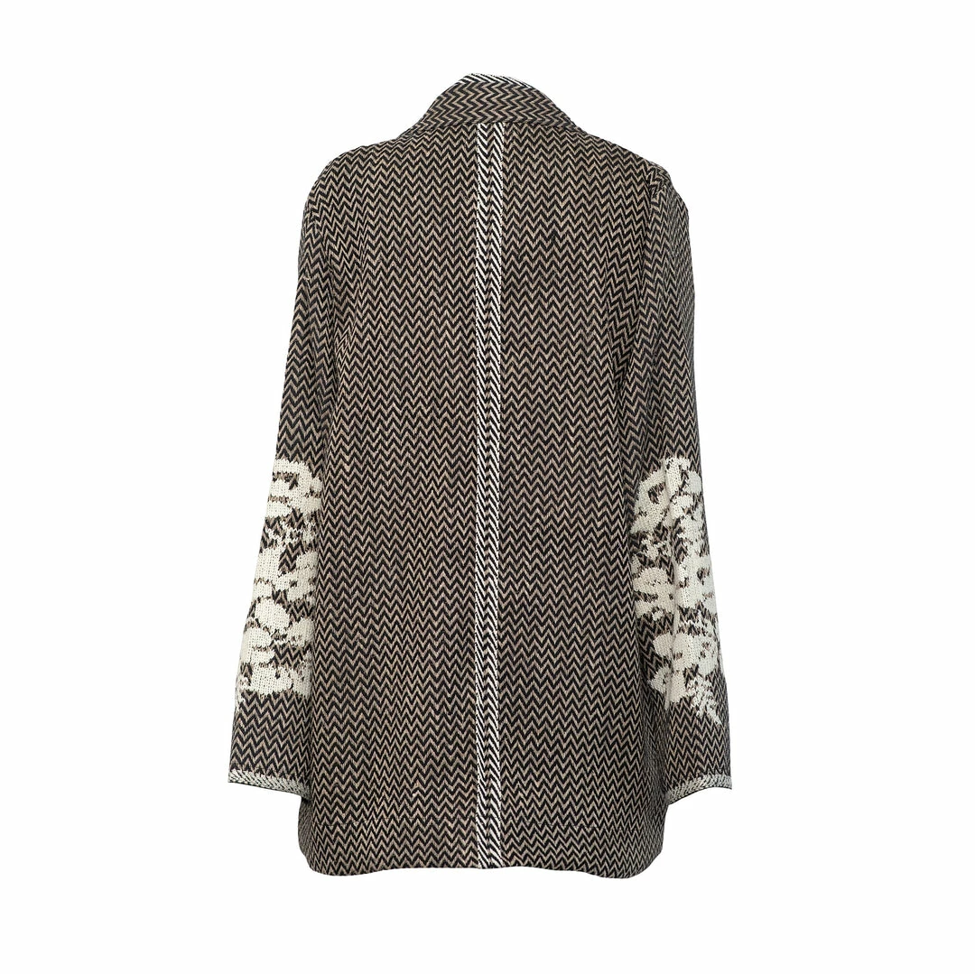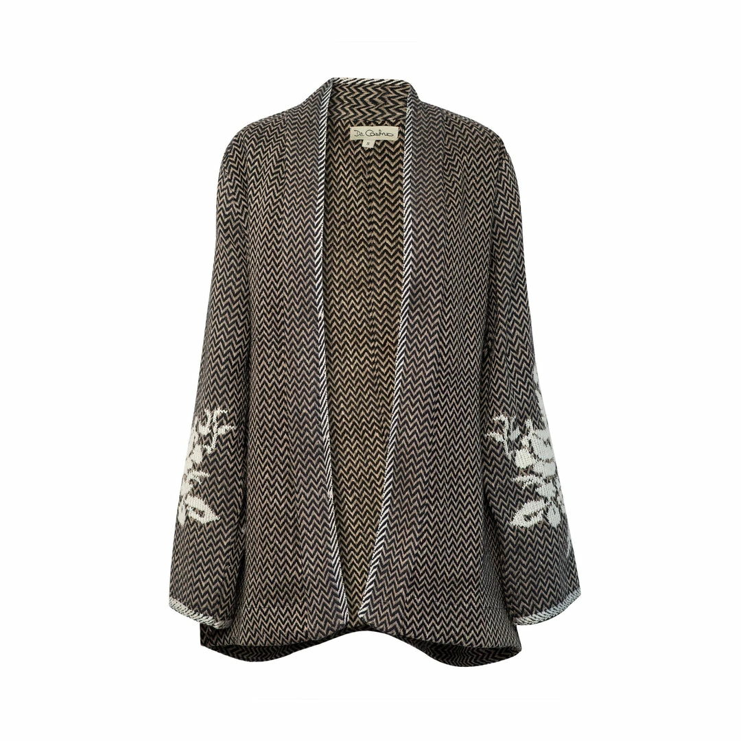 The Dark Cielo jacket is made of flowy mixture of linen and cotton  from the South of India. This kimono style jacket features soft hand-embroidered flowers on each sleeve.