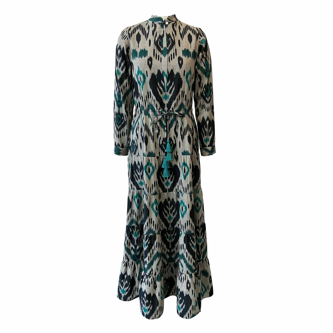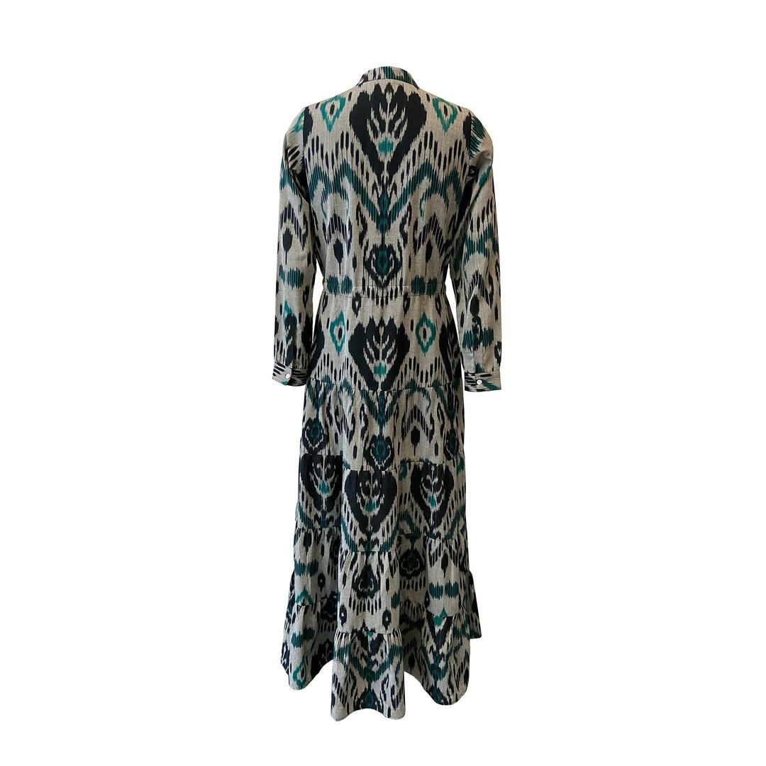 The Grey Dueña Dress made of Grey, Black and Aqua blue handloom Ikat from India. This elegant dress features long sleeves, mandarin collar, front buttons and pull waist string.