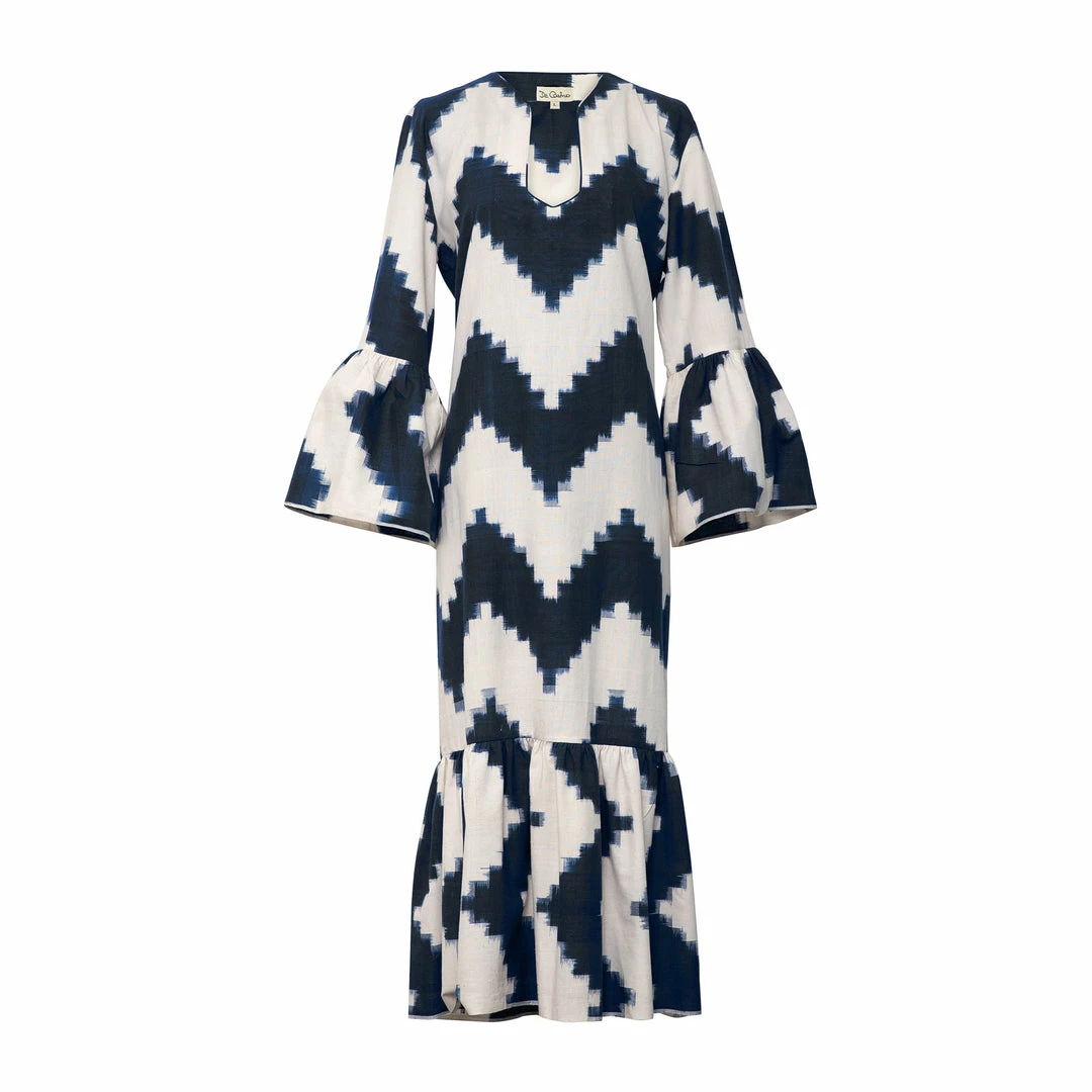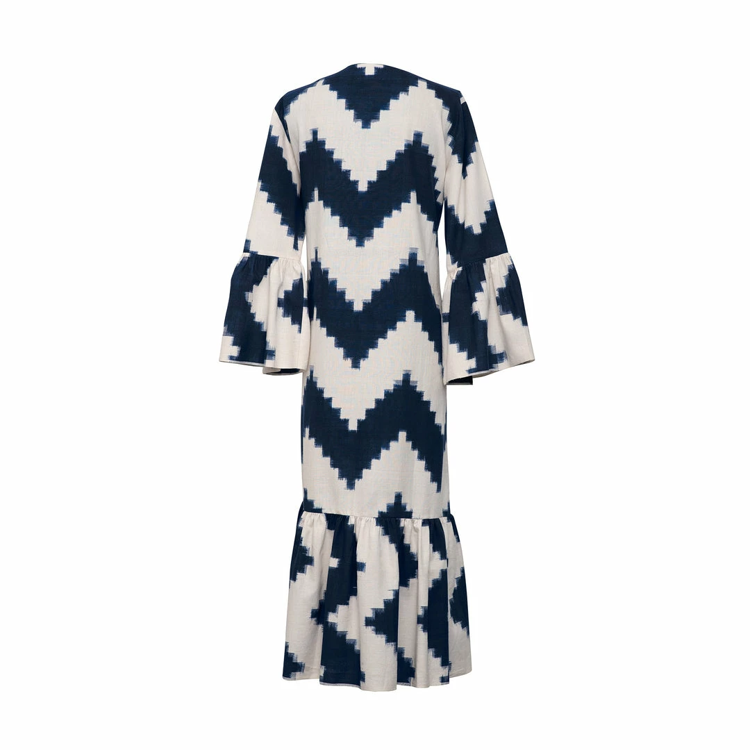 The “Zig Zag Navy Blue” tunic dress is crafted from organic cotton, handwoven in the south of India.
