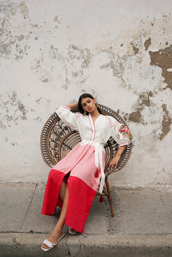 This colour-block dress is made from handwoven linen in the south of India. It features floral cross stitch embroidery and a belt.
