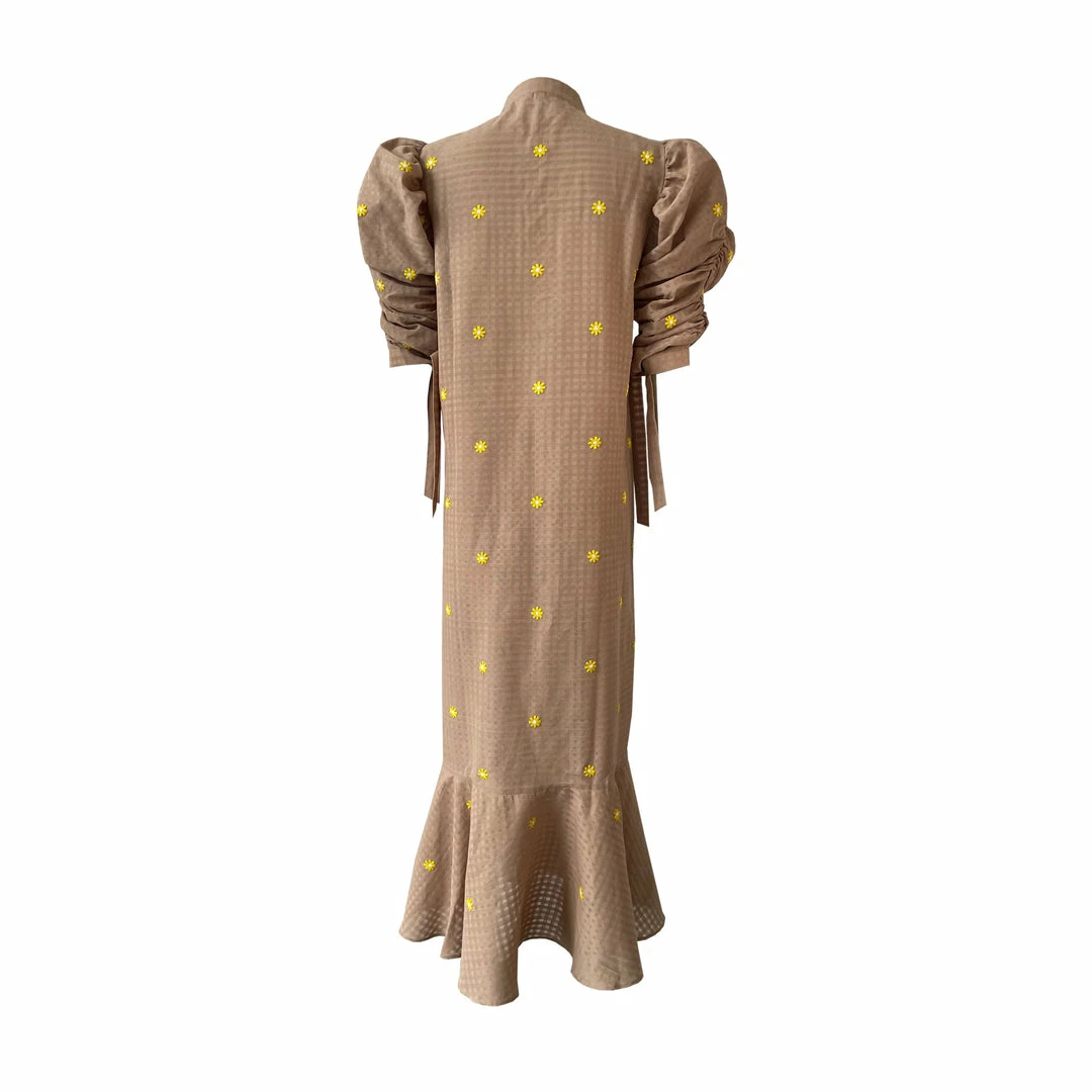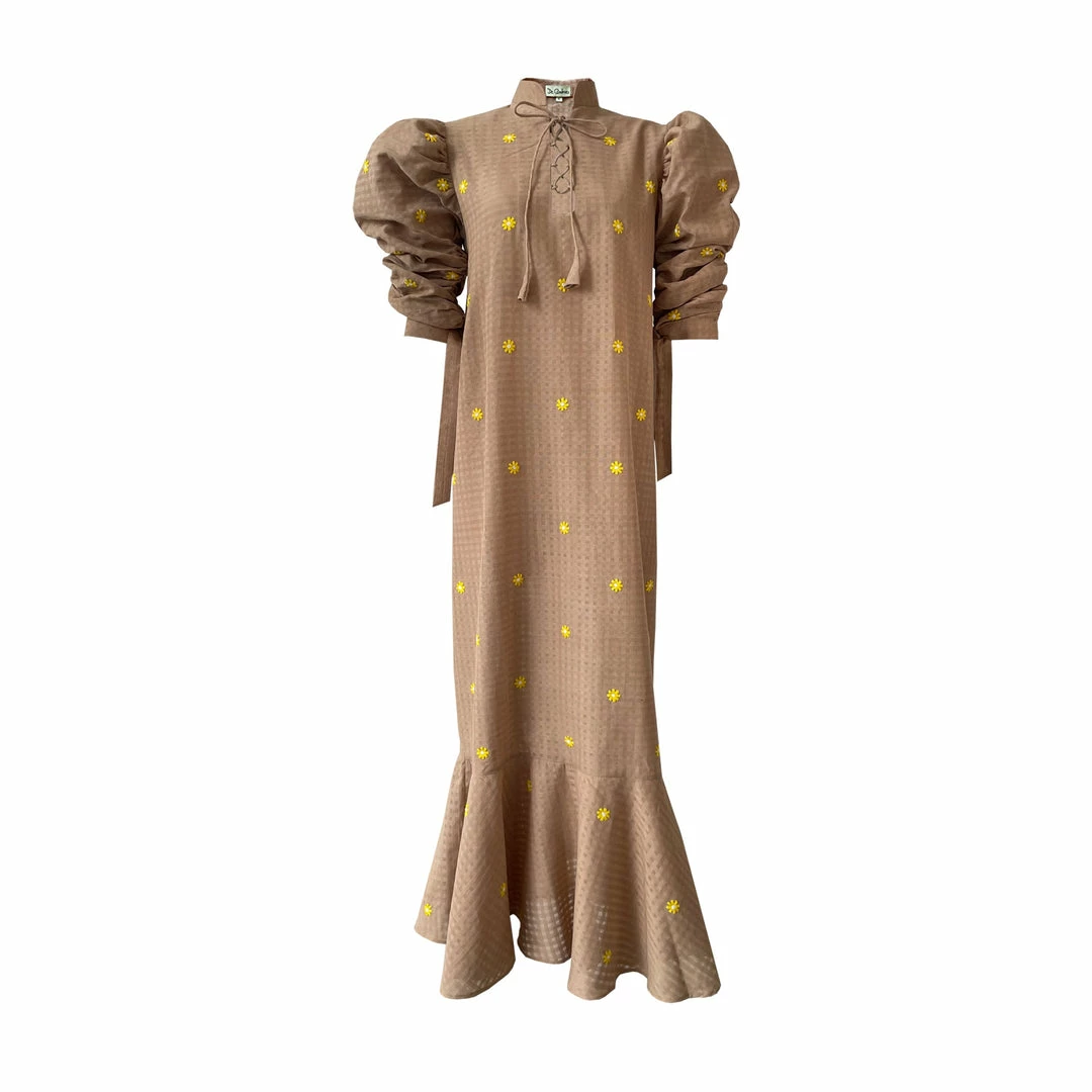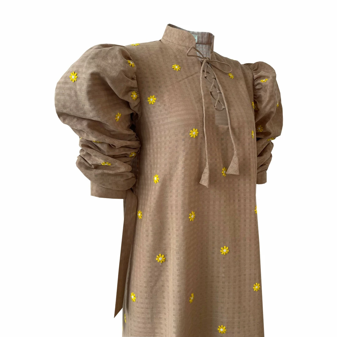 The Margarita Dress is made in pure Khadi handloom cotton in earth tones. It features yellow hand-embroidered flowers, gathered puff sleeves and wide ruffle hem.