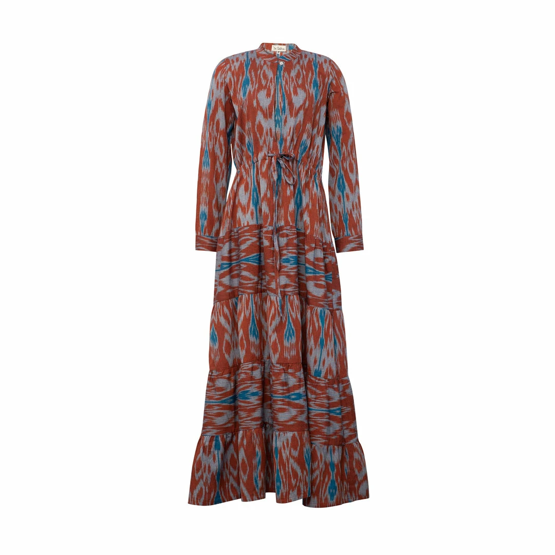 The Orange Dueña dress is made of orange, grey and blue handloom Ikat from India. This tropical dress features long sleeves, mandarin collar, long sleeves and pull waist string.