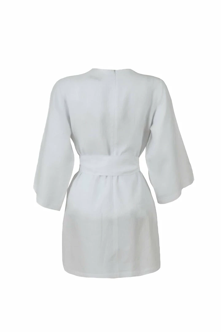 Mini Linen Dress Ruffle Sleeves with Floral Embroidery