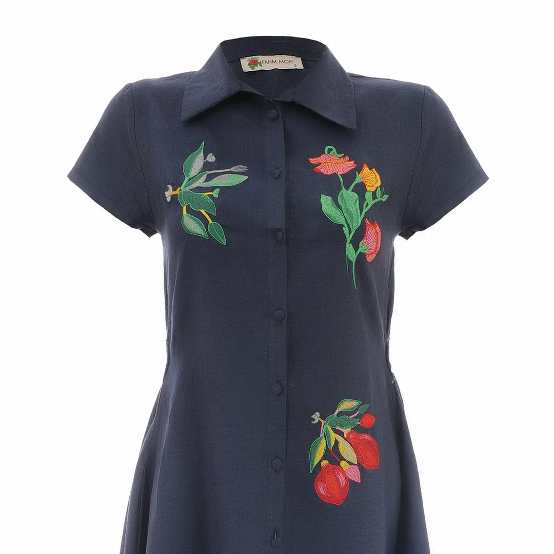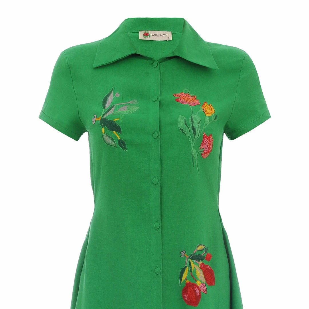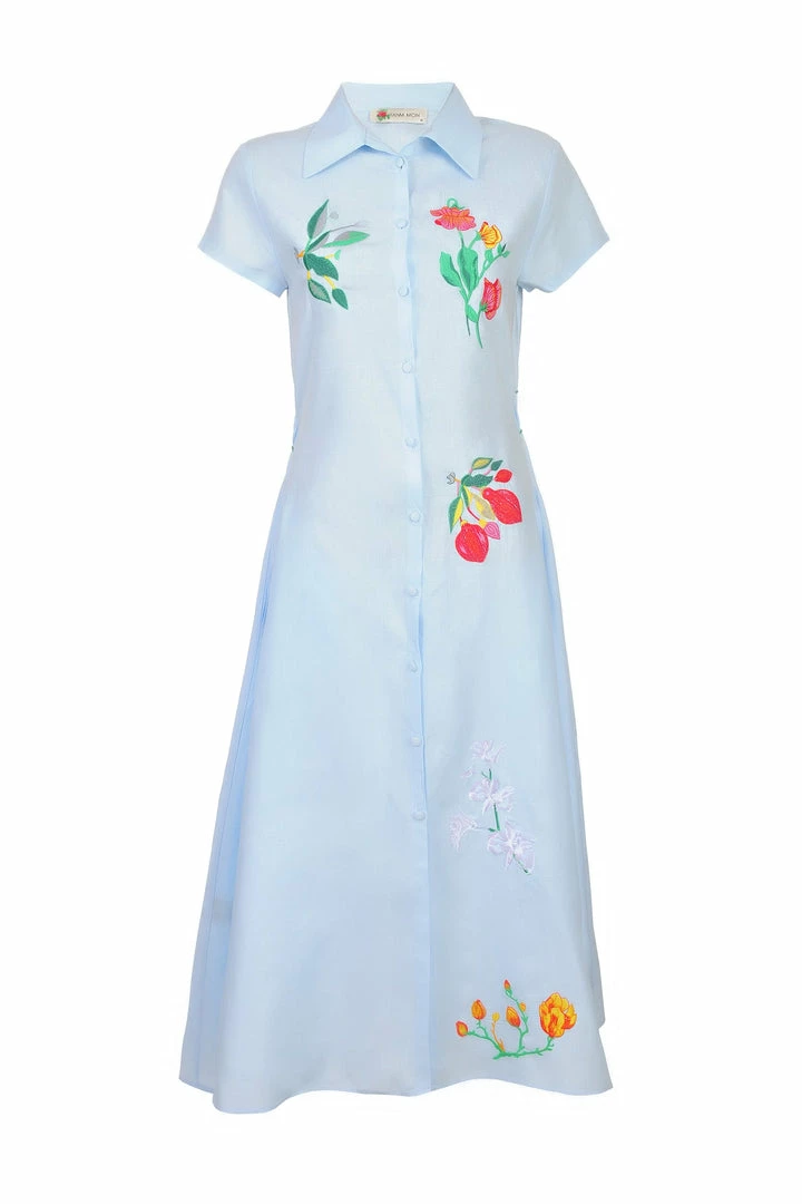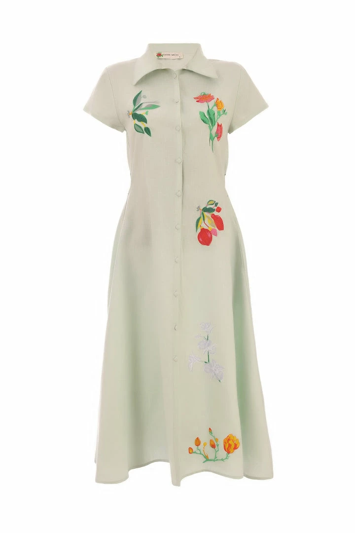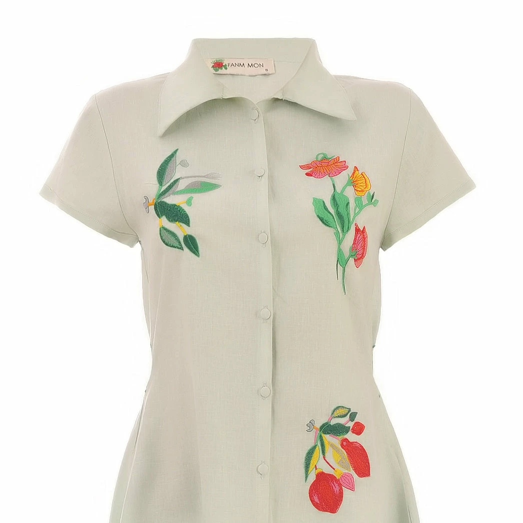 Midi Linen Shirt Dress with Front Button Detachable Belt Floral Embroidered