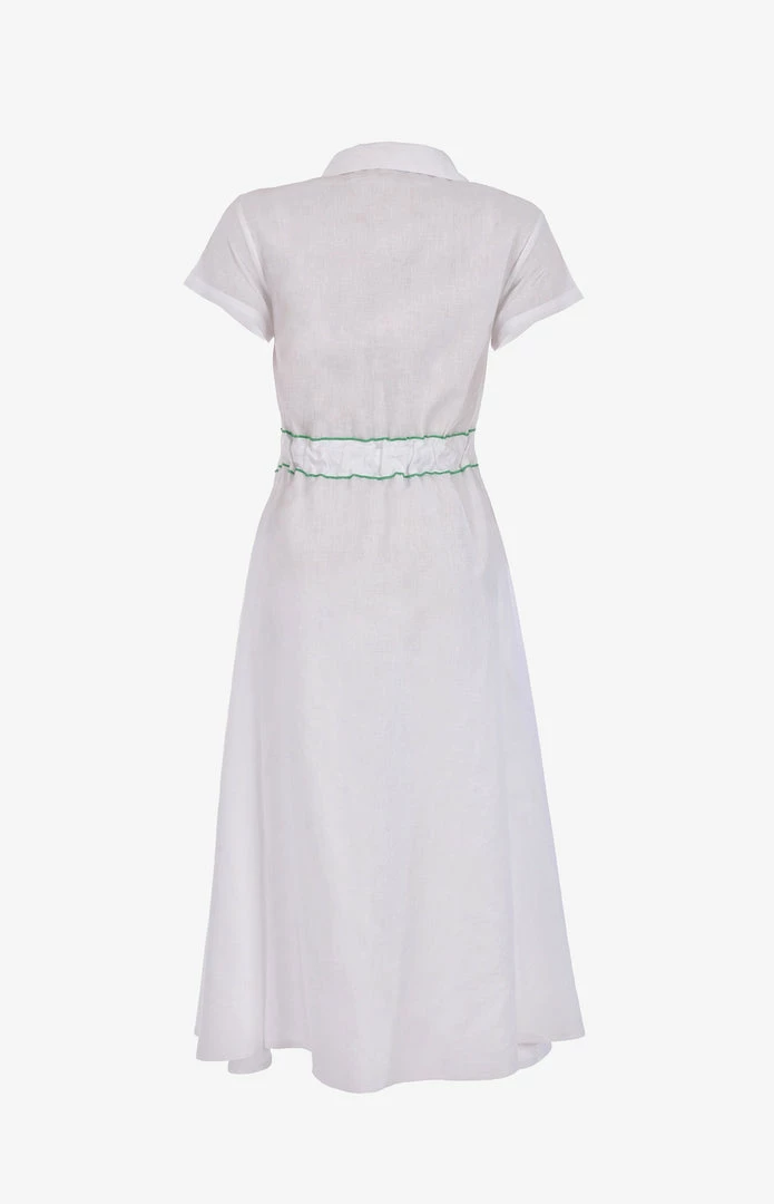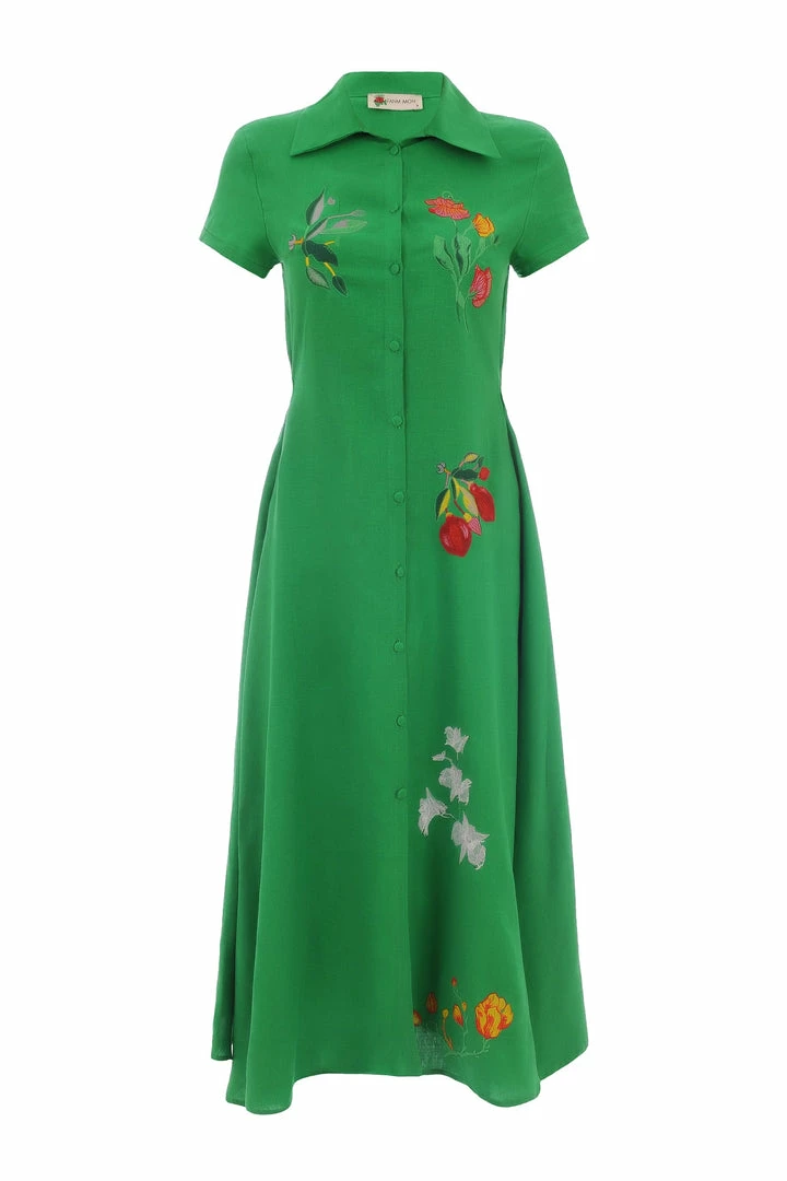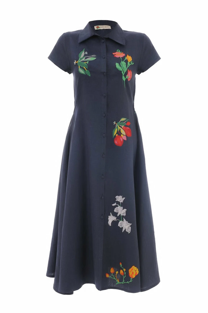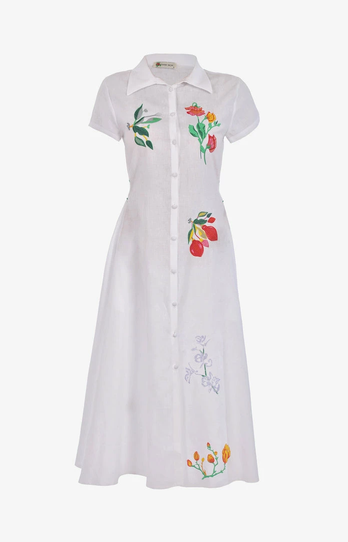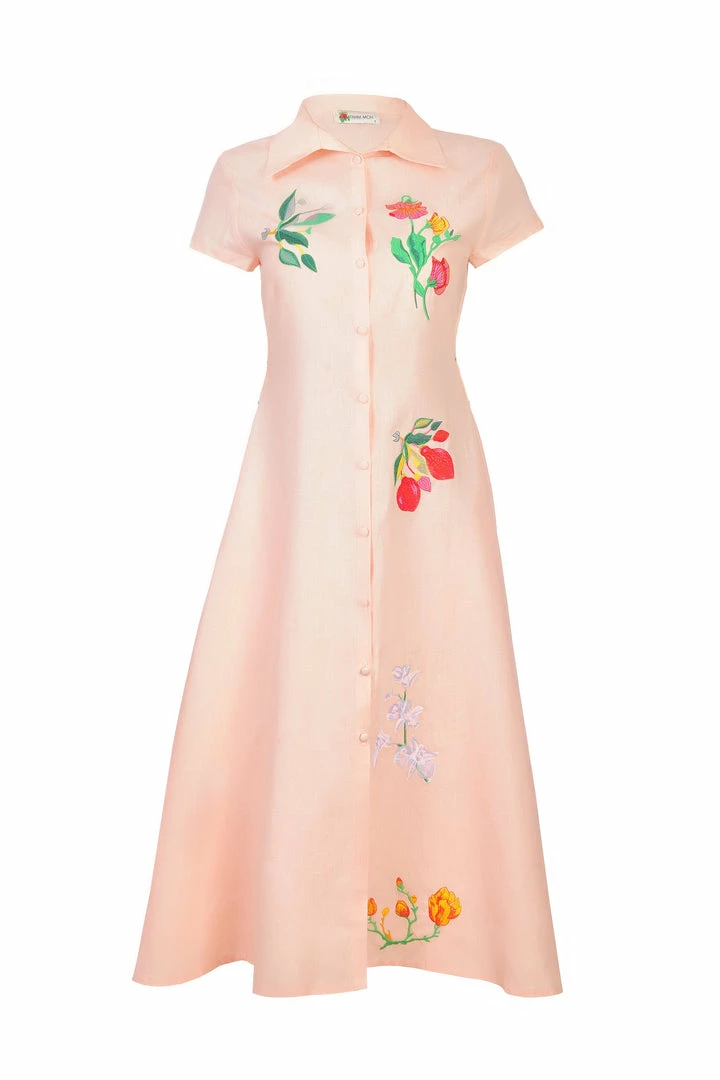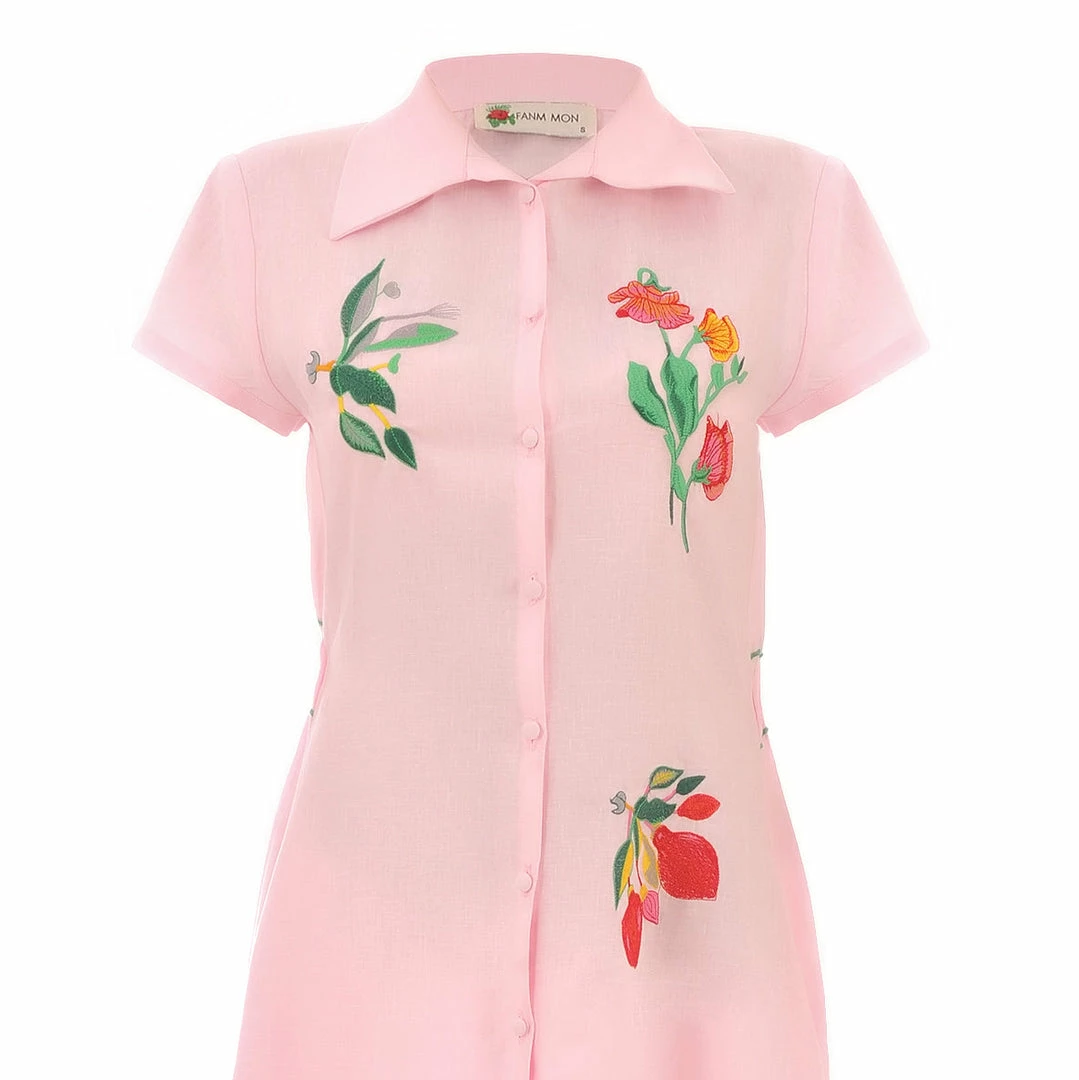 Midi Linen Shirt Dress with Front Button Detachable Belt Floral Embroidered