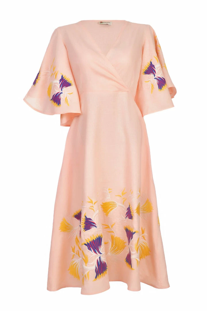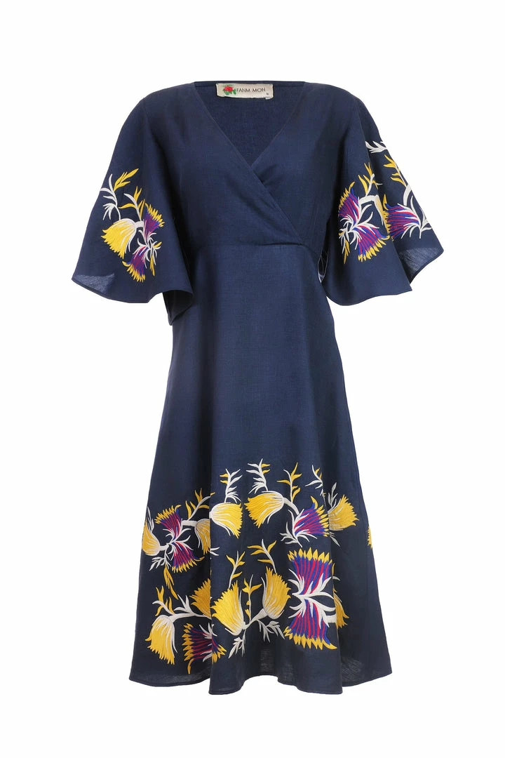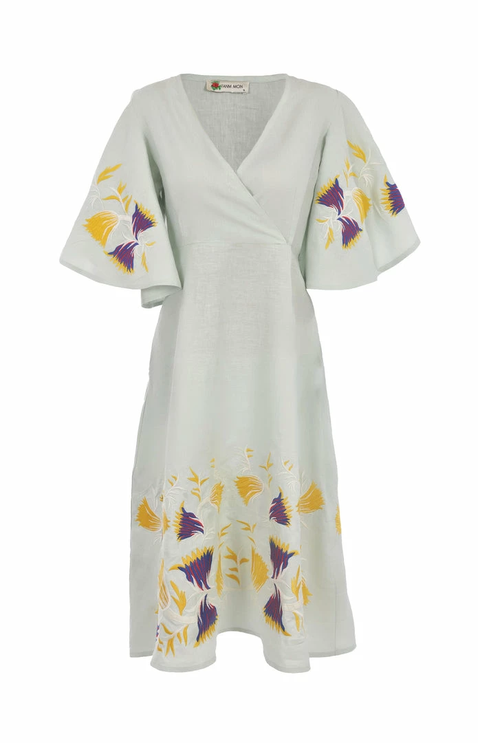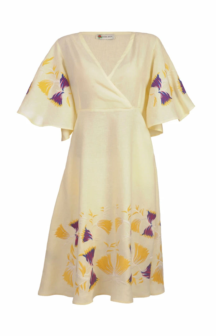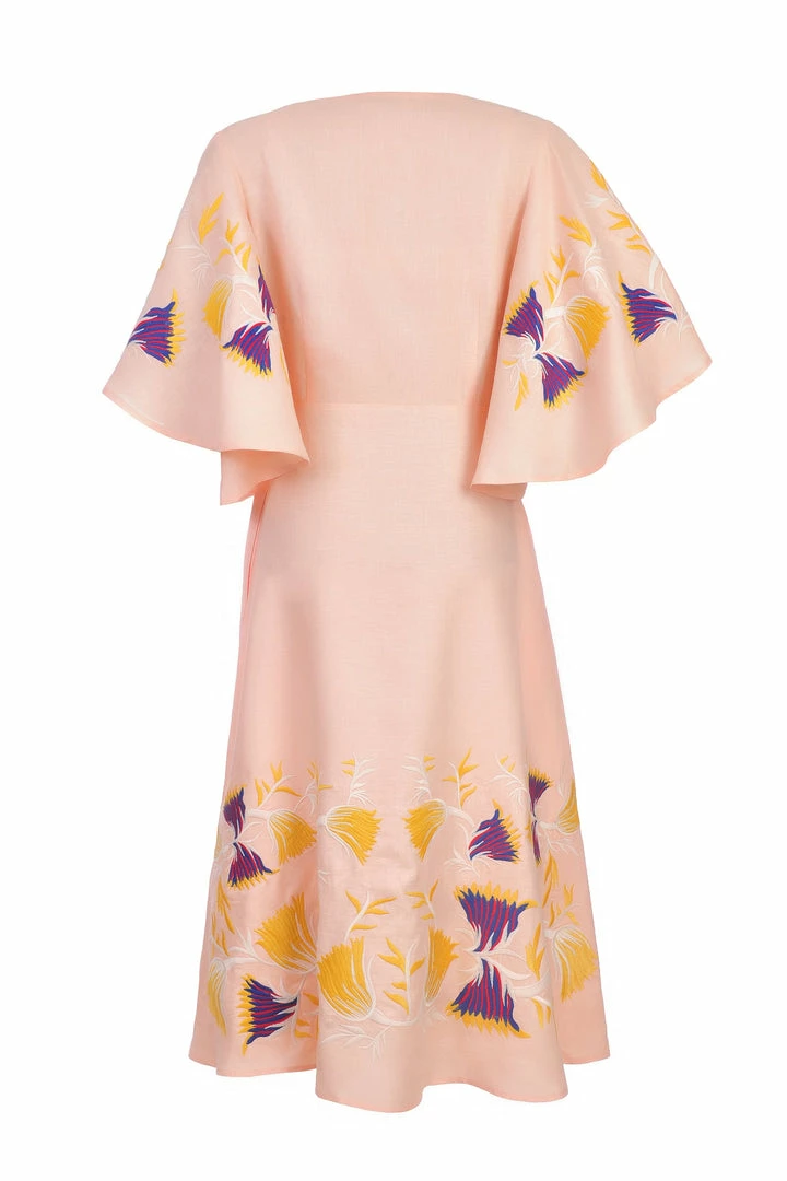 Midi Linen Faux Wrap V Neck Dress with Embroidery