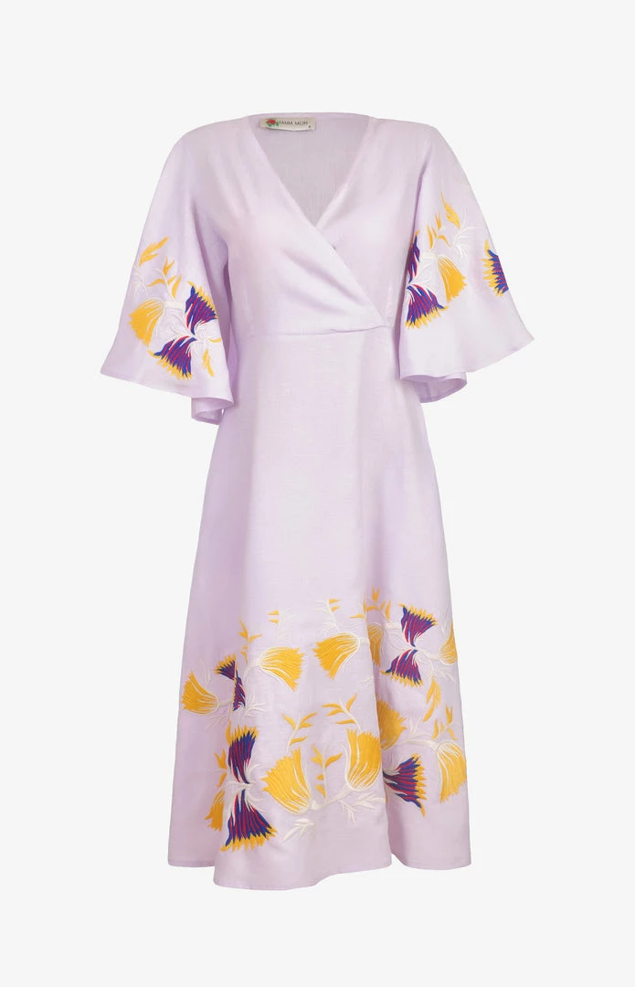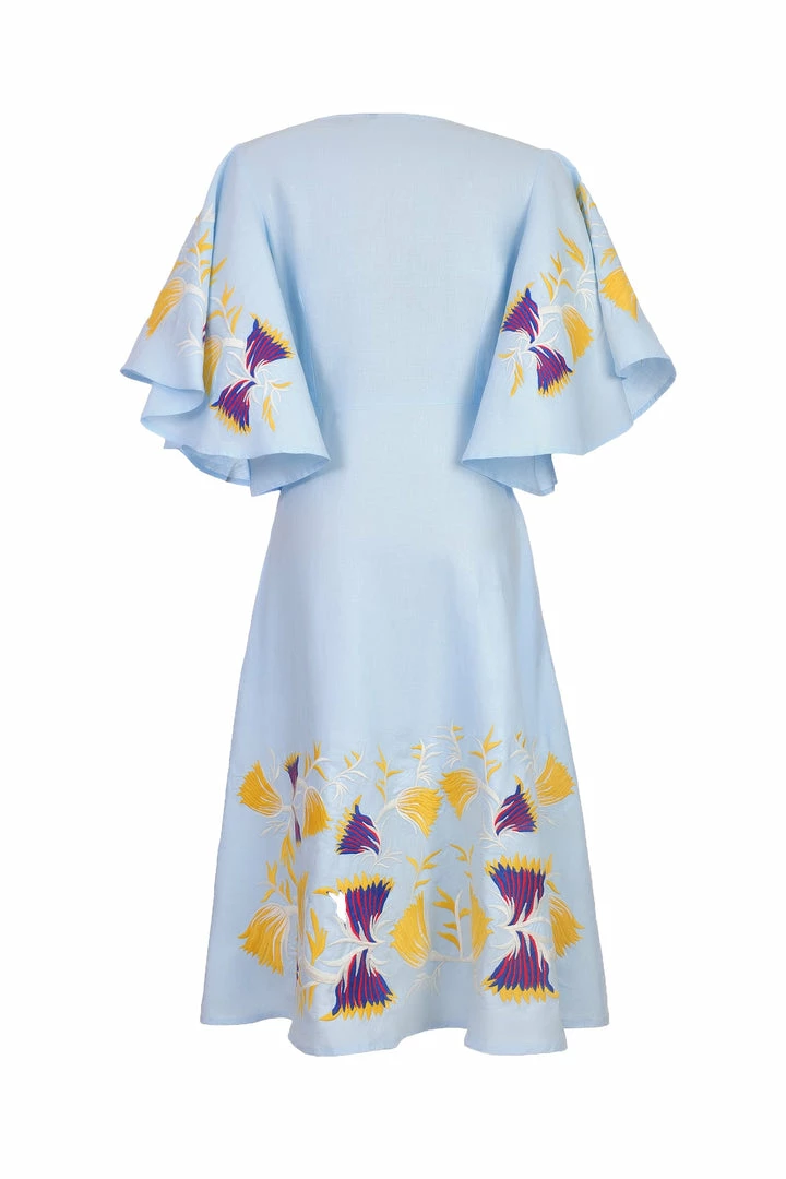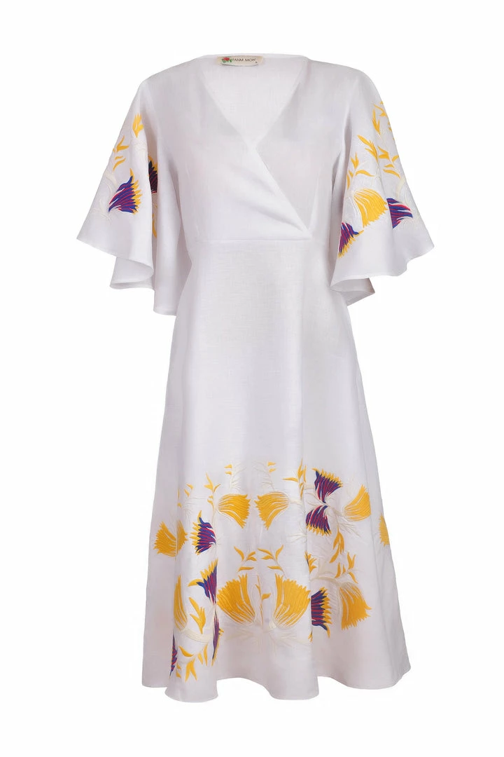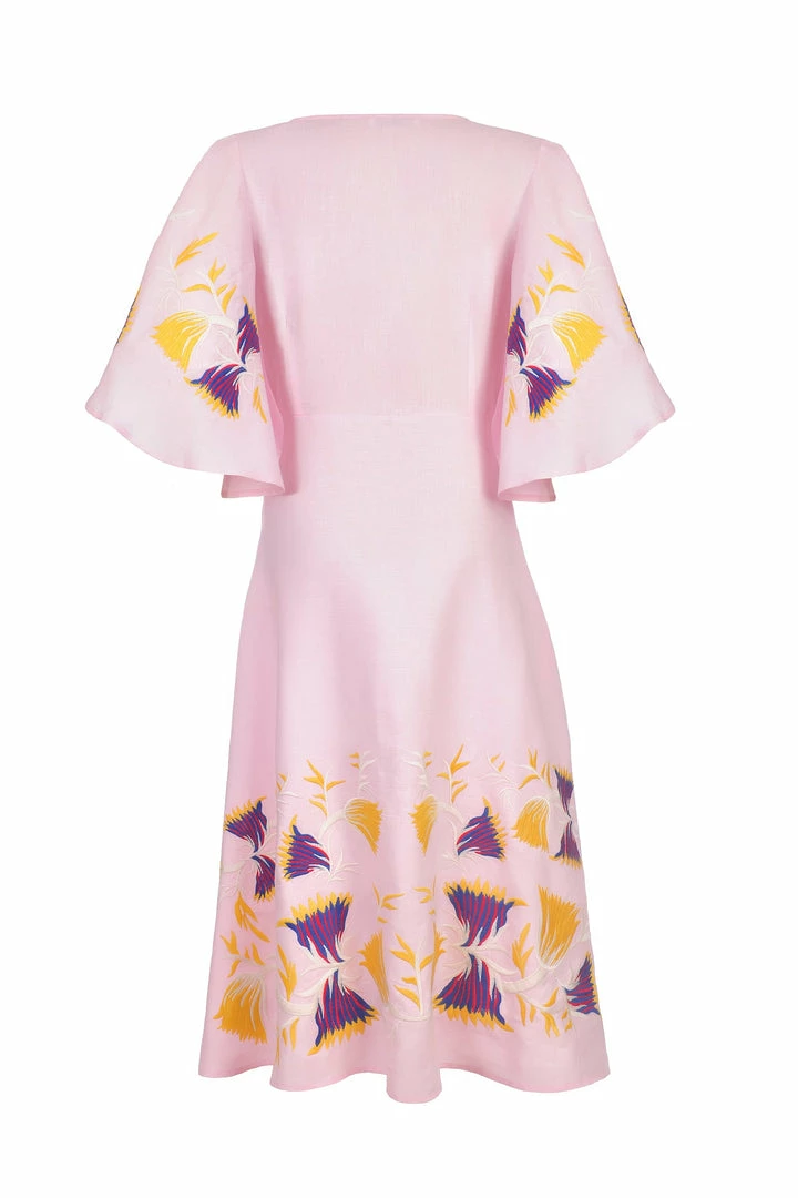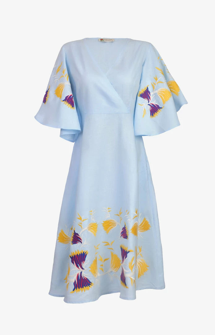 Midi Linen Faux Wrap V Neck Dress with Embroidery