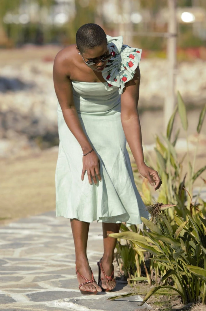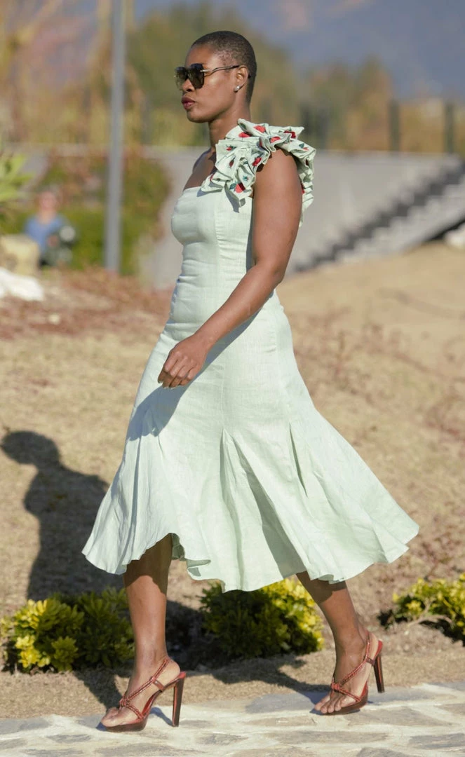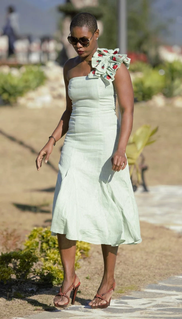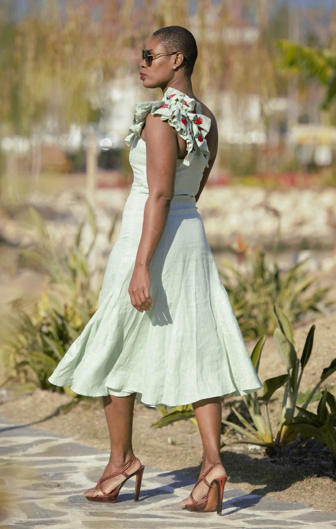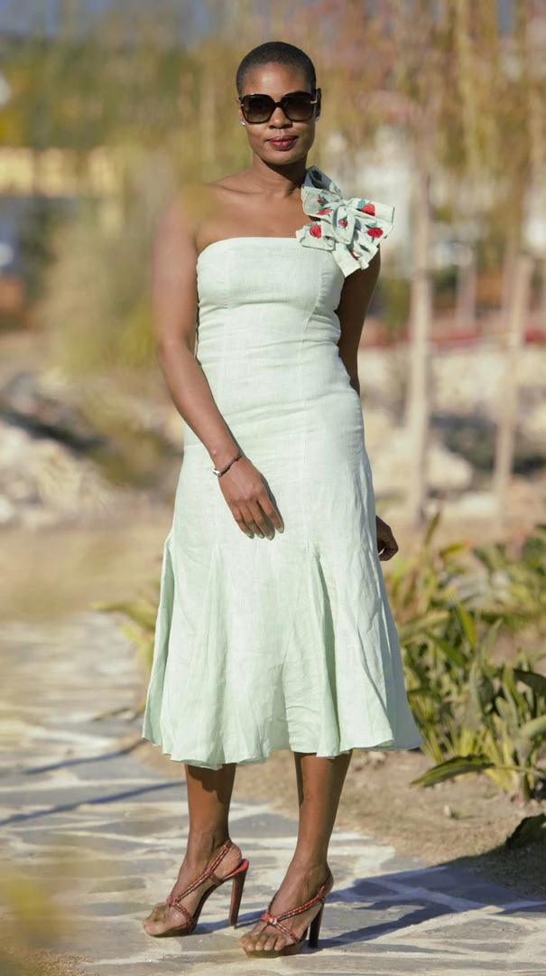 One Shoulder True Fit Midi Linen Dress with Floral Embroidery Strapless