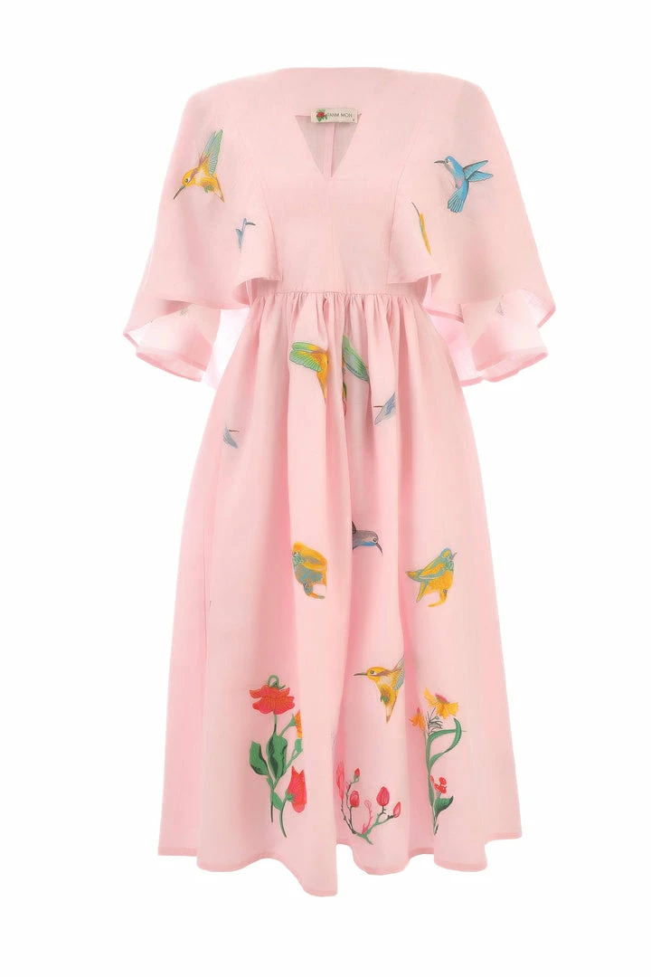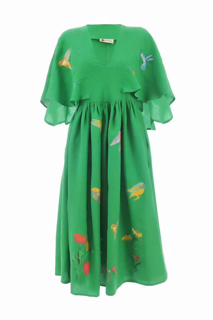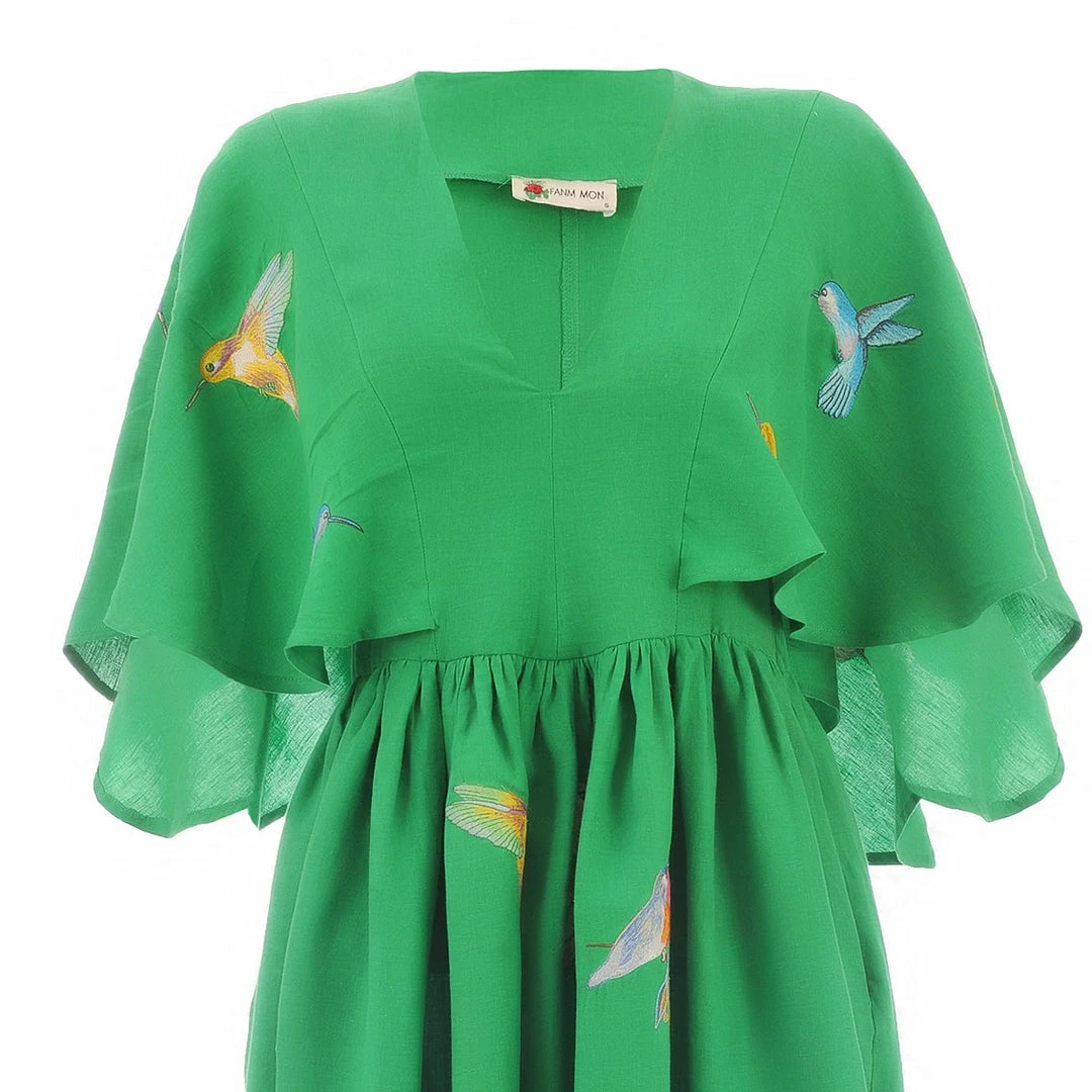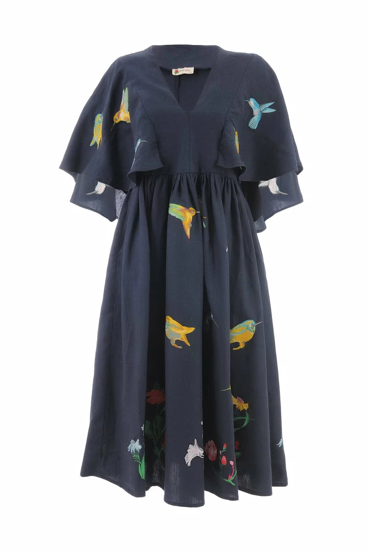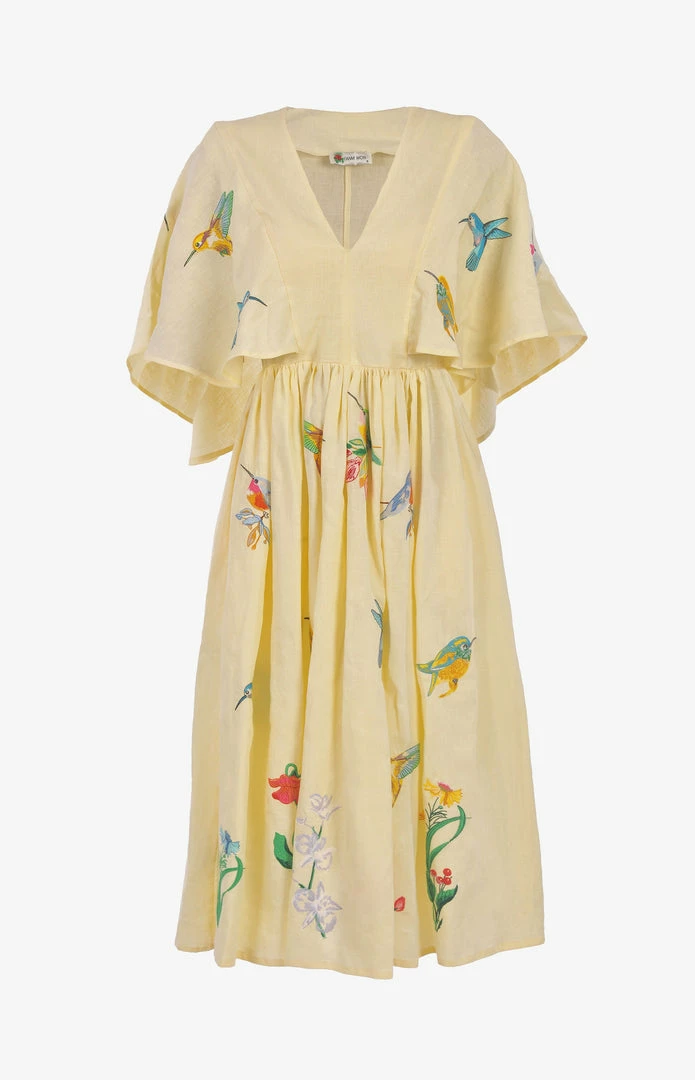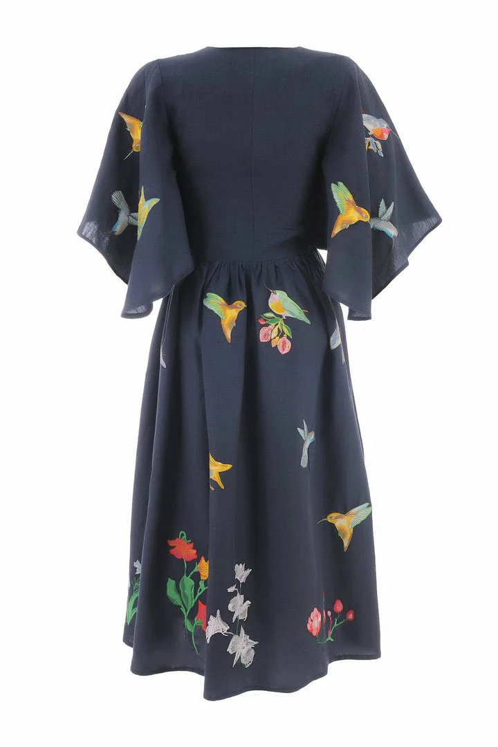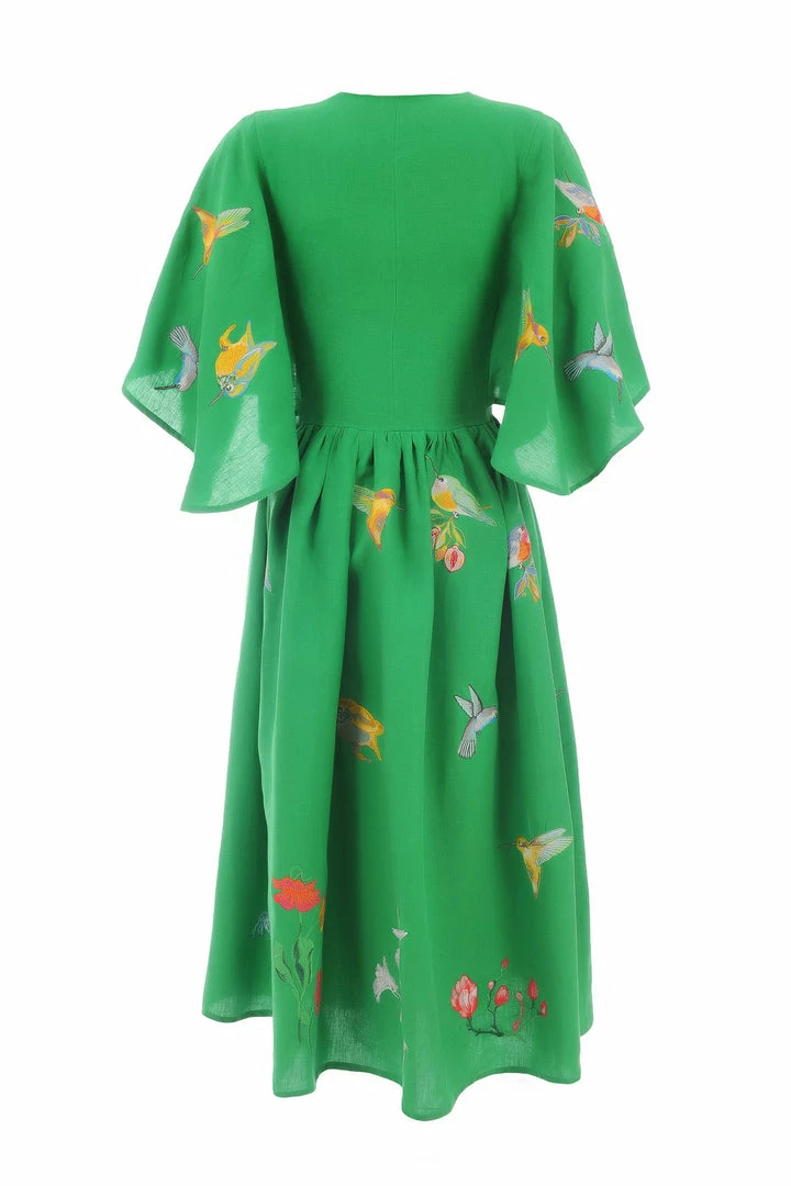 Midi Linen V Neck Dress with Cape Sleeves and Birds Embroidery