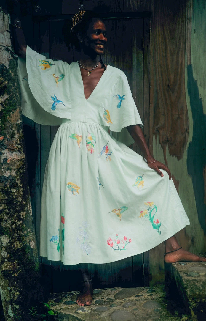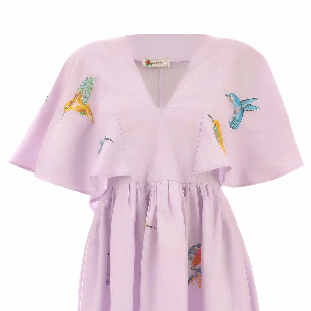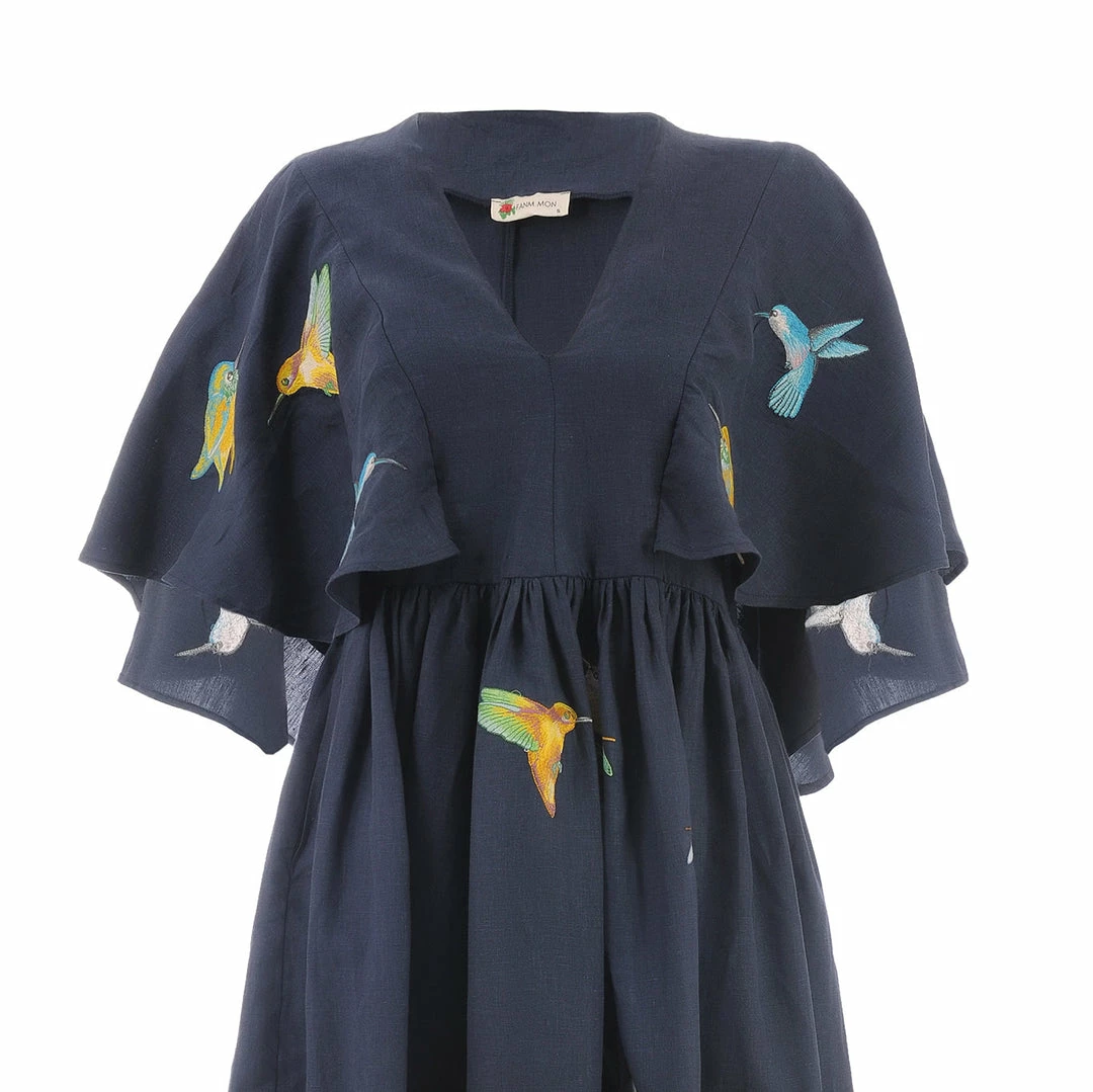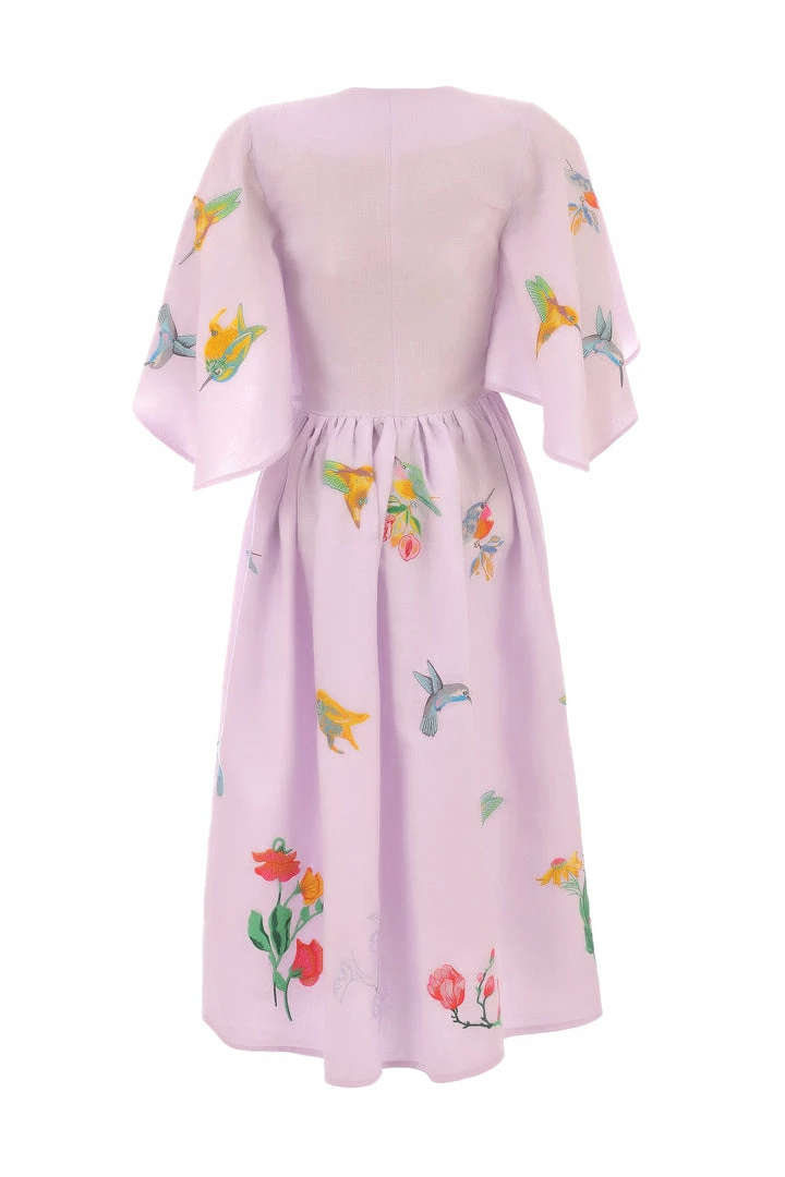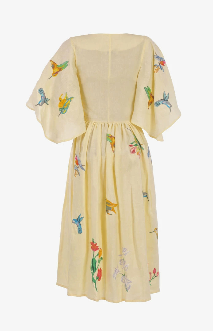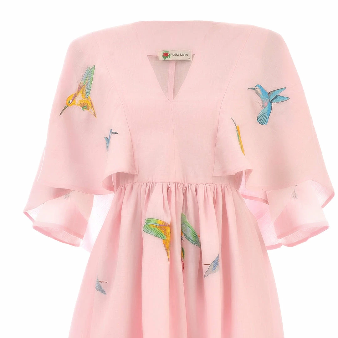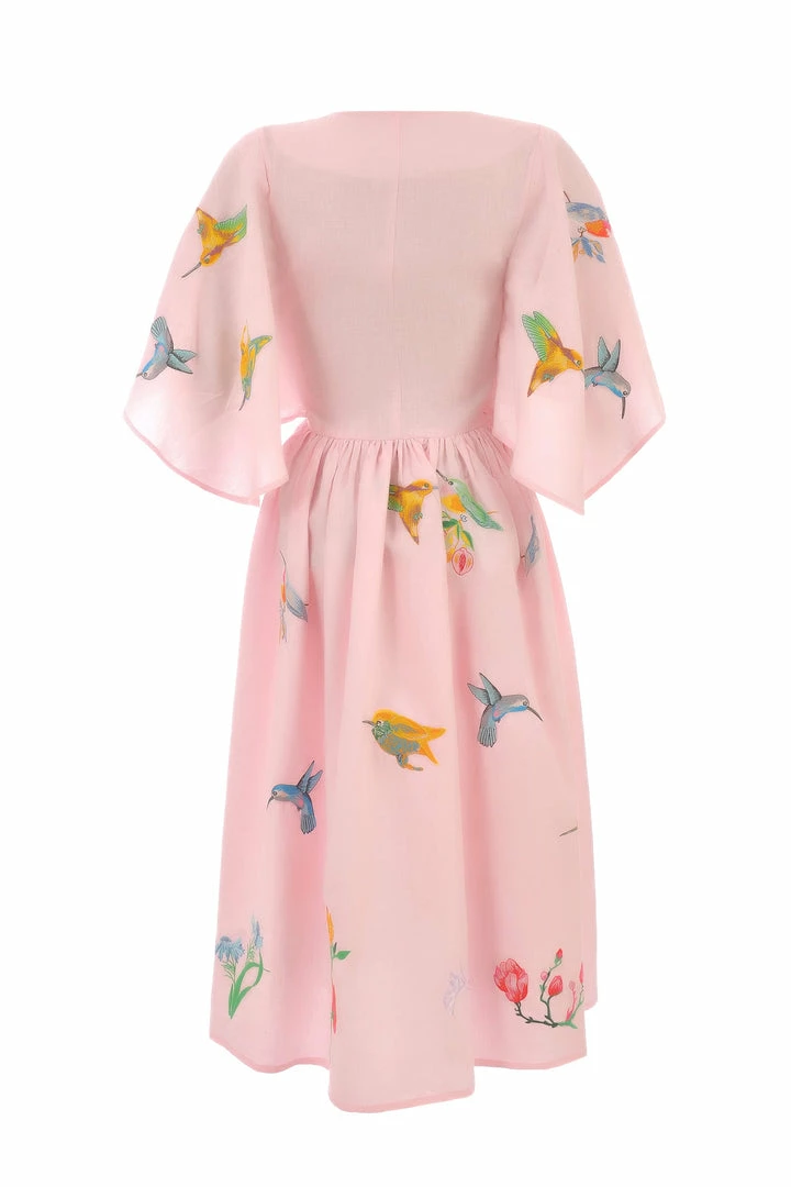 Midi Linen V Neck Dress with Cape Sleeves and Birds Embroidery