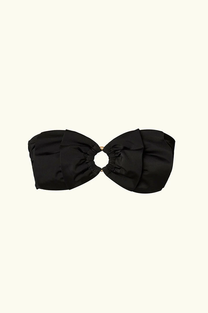 Featuring two ruffled bows on either side of its gold center ring, a clean finish (no seams show), removable bra cups, and a tie back closure that ensures the perfect fit. It also includes a removable halter strap so you can choose if you’d like the extra support, or go strapless.Â