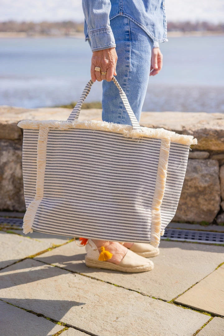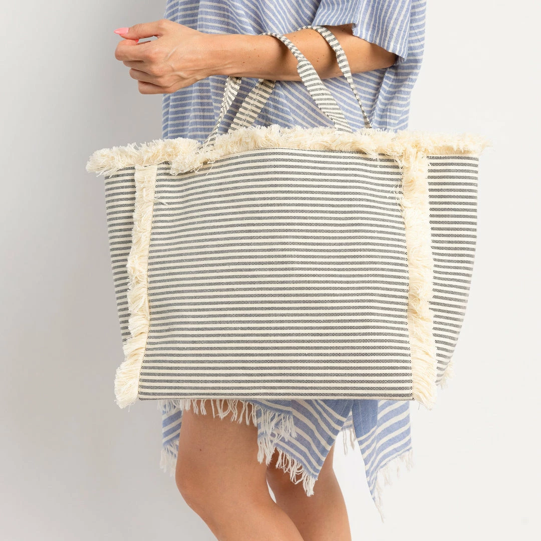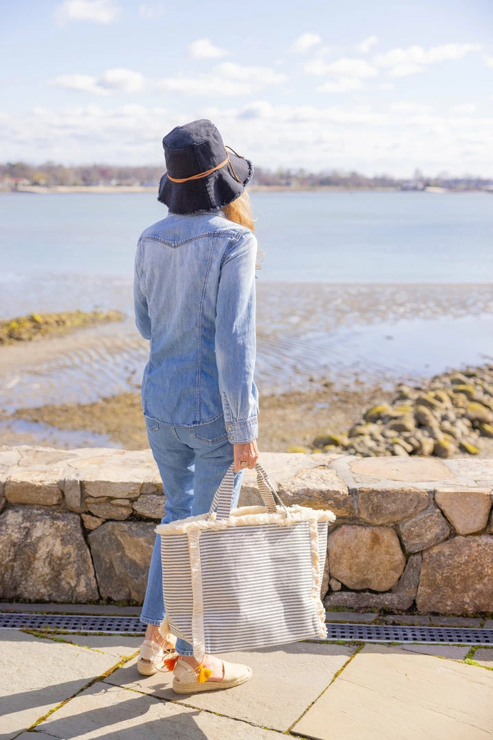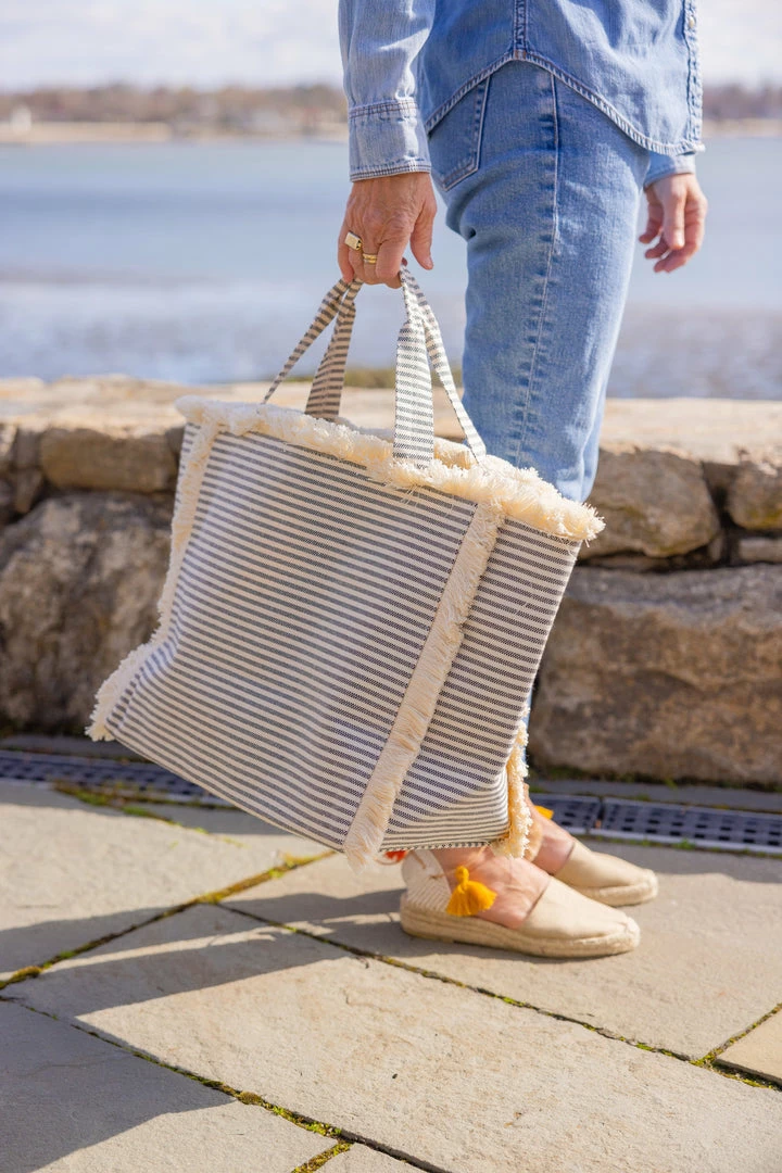 The launch tote is a packable canvas tote that can fit all of your beach essentials, or as a travel bag on a flight. This canvas beach tote comes in solid or stripe, both with frayed edge detail.Material: 100% Cotton, Lining – 100% Cotton Poplin